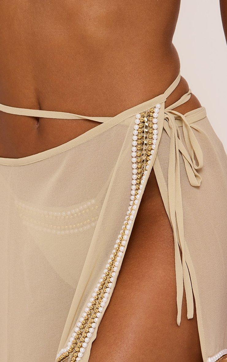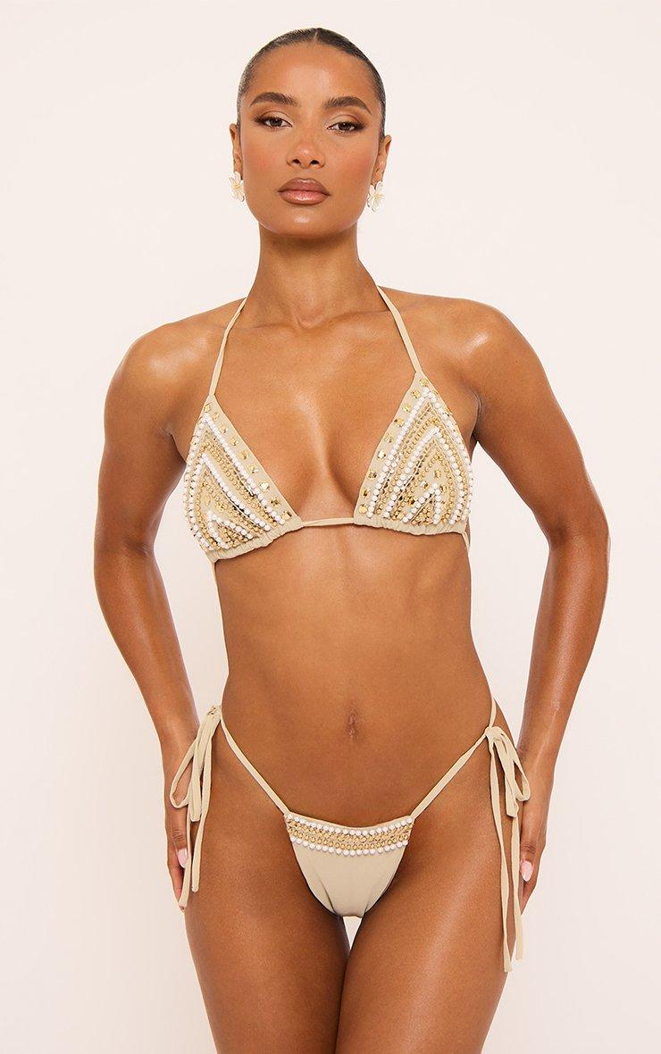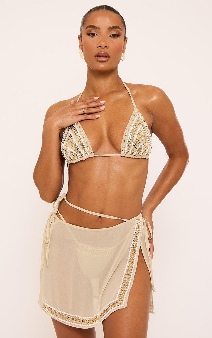 Bead Detail Triangle Bikini Set And Matching Sarong 3 Piece Set In Stone