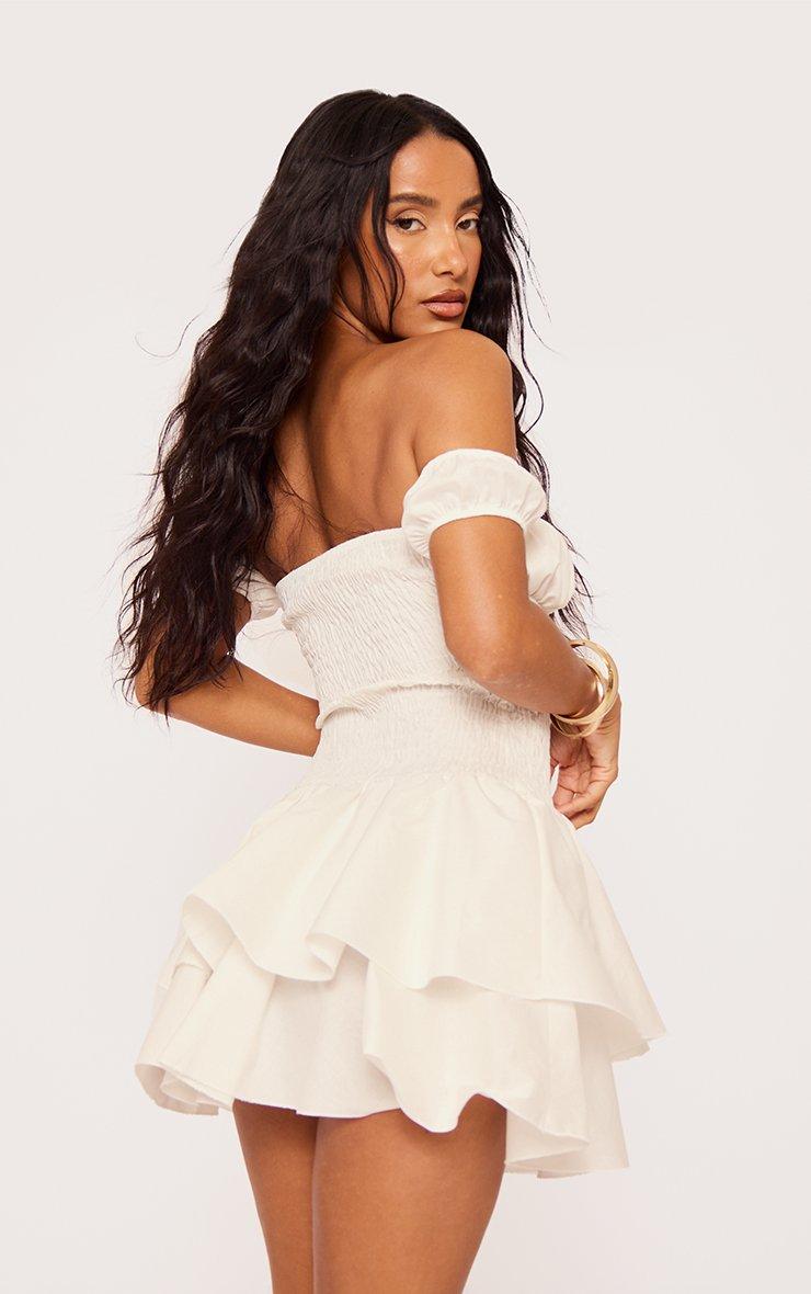 Bardot Shirred Waist Detail Layered Hem Mini Dress In Cream