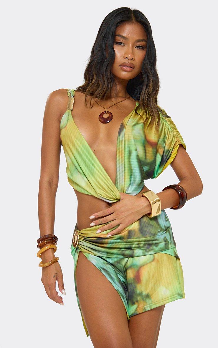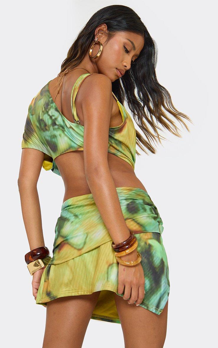 Cowl Neck Trim Detail Crop Top In Green Abstract Print