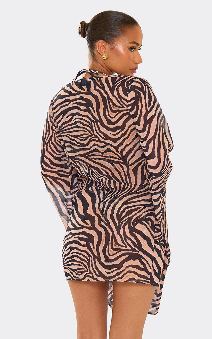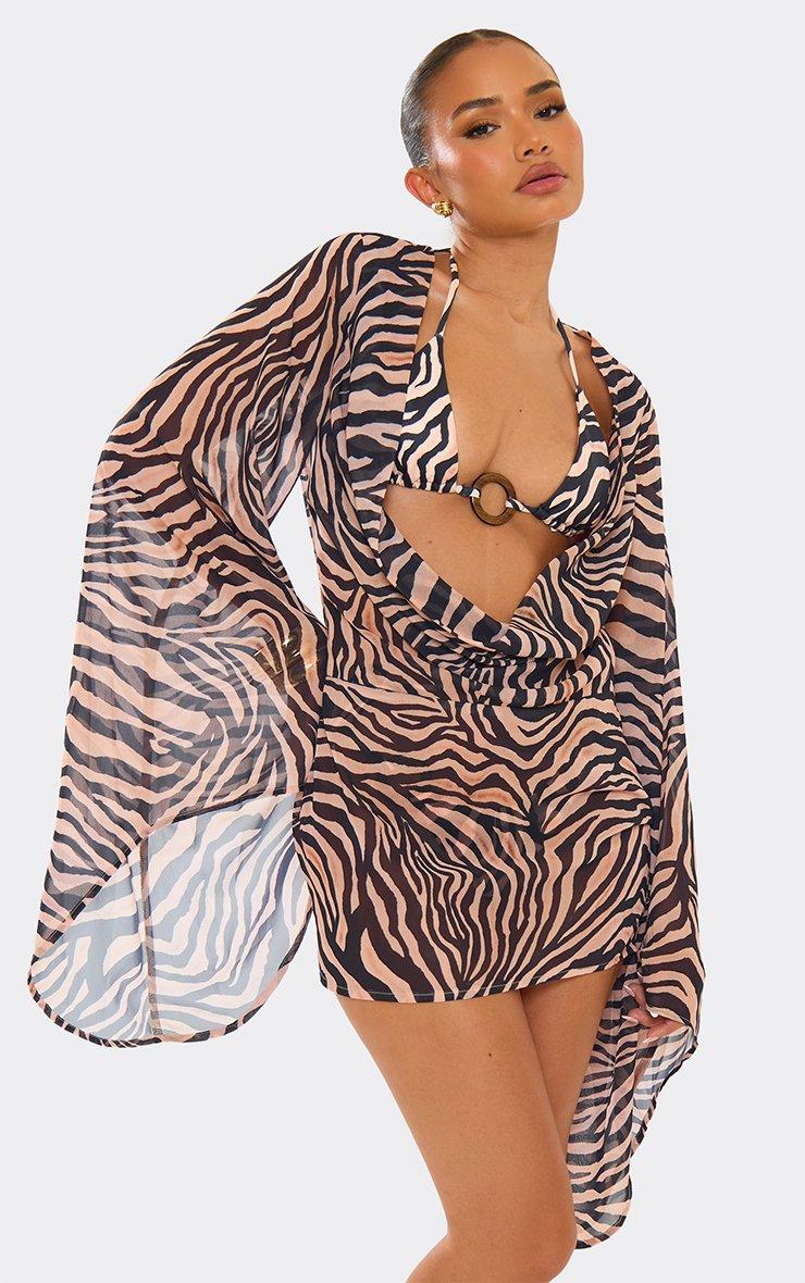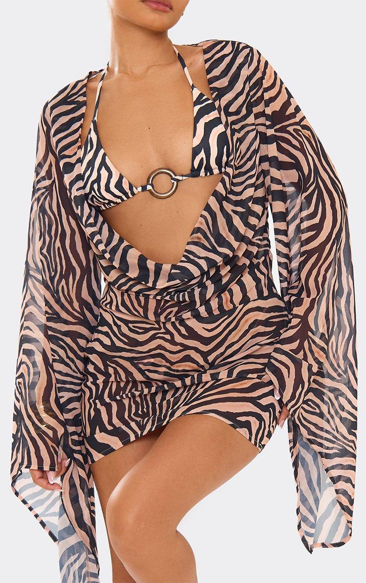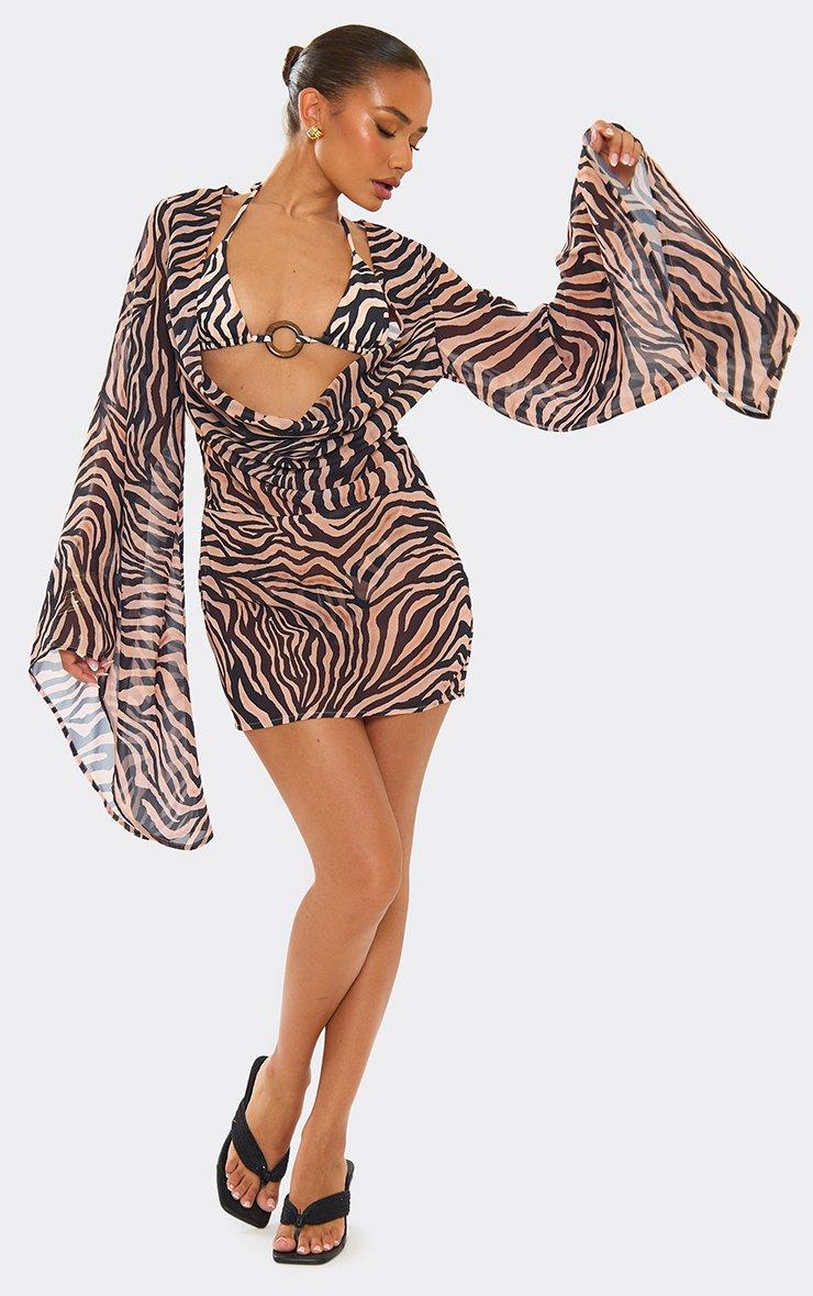 Cowl Neck Flared Sleeve Mini Dress In Brown Zebra Print Mesh