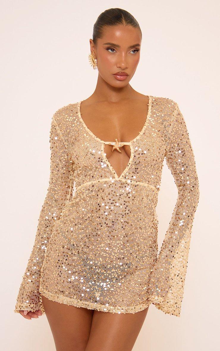 Flared Sleeve Plunge Neck Starfish Trim Detail Mini Beach Dress In Gold Sequin