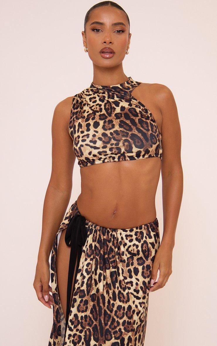 Sleeveless High Neck Crop Top In Brown Leopard Print