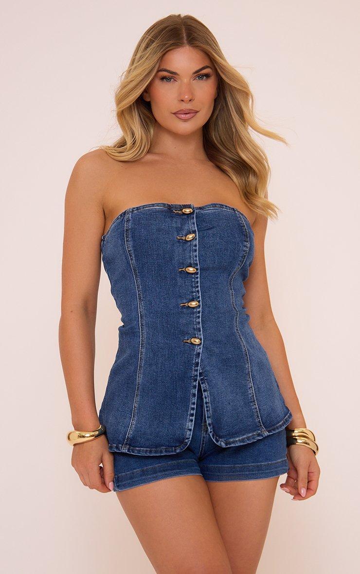 Bandeau Button Front Contrast Seam Detail Top And Shorts Co-Ord Set In Blue Denim