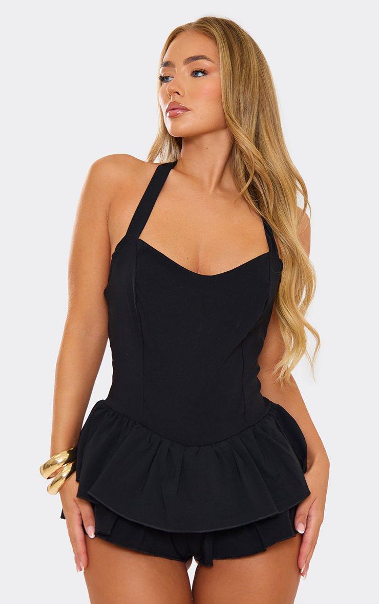 Halterneck Detail Frill Hem Playsuit In Black