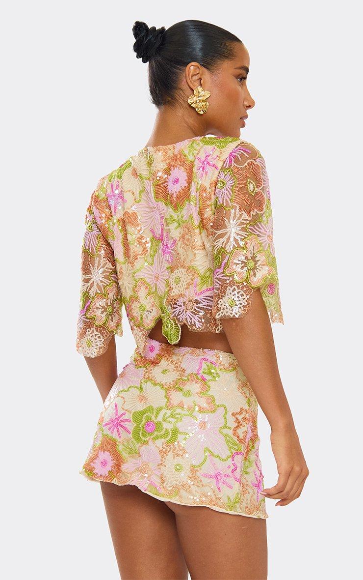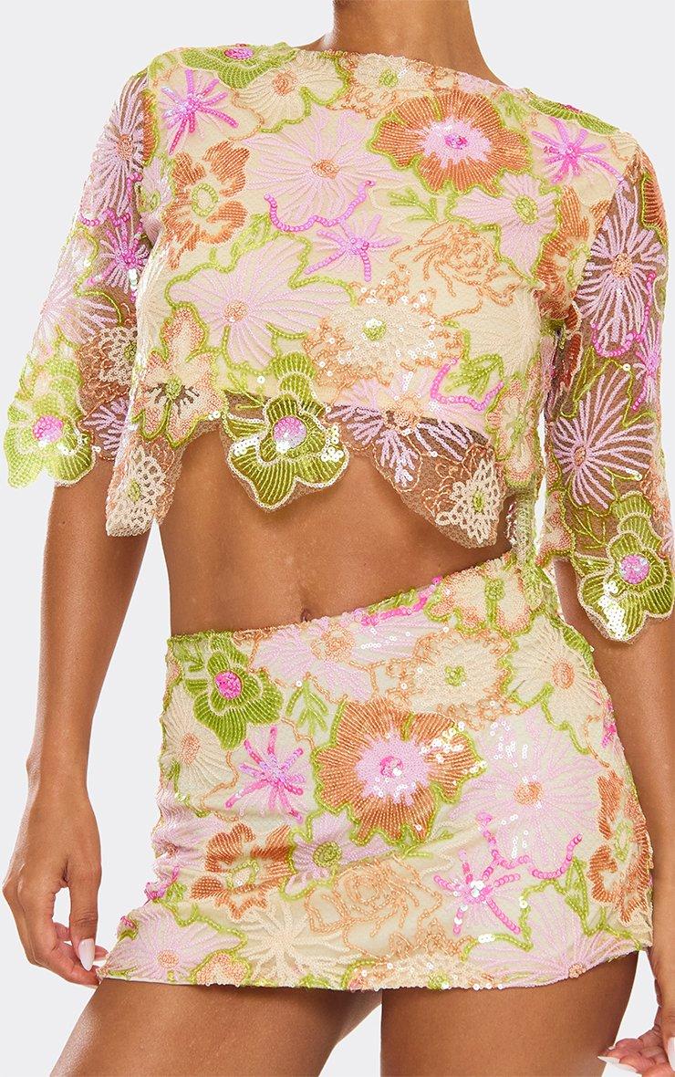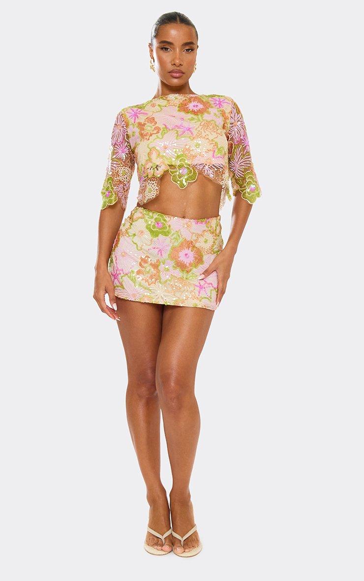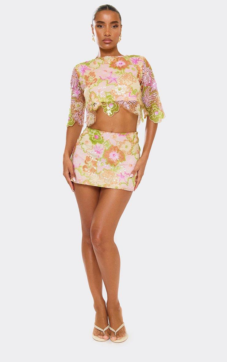 Mid Waist Floral Embellished Mini Skirt In Green Multi Sequin