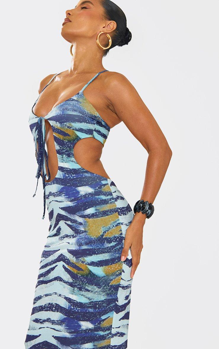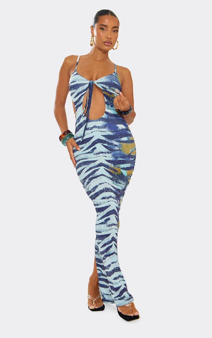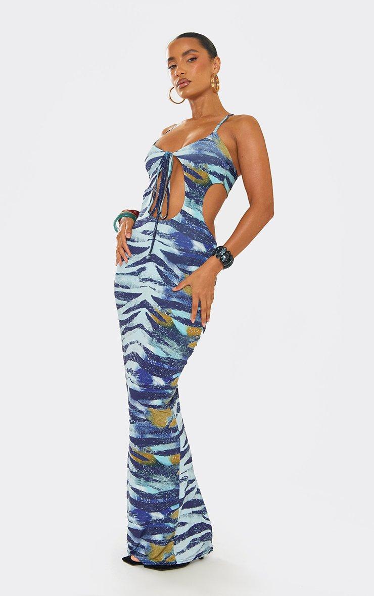 Strappy Cut Out Tie Front Detail Maxi Dress In Blue Zebra Print