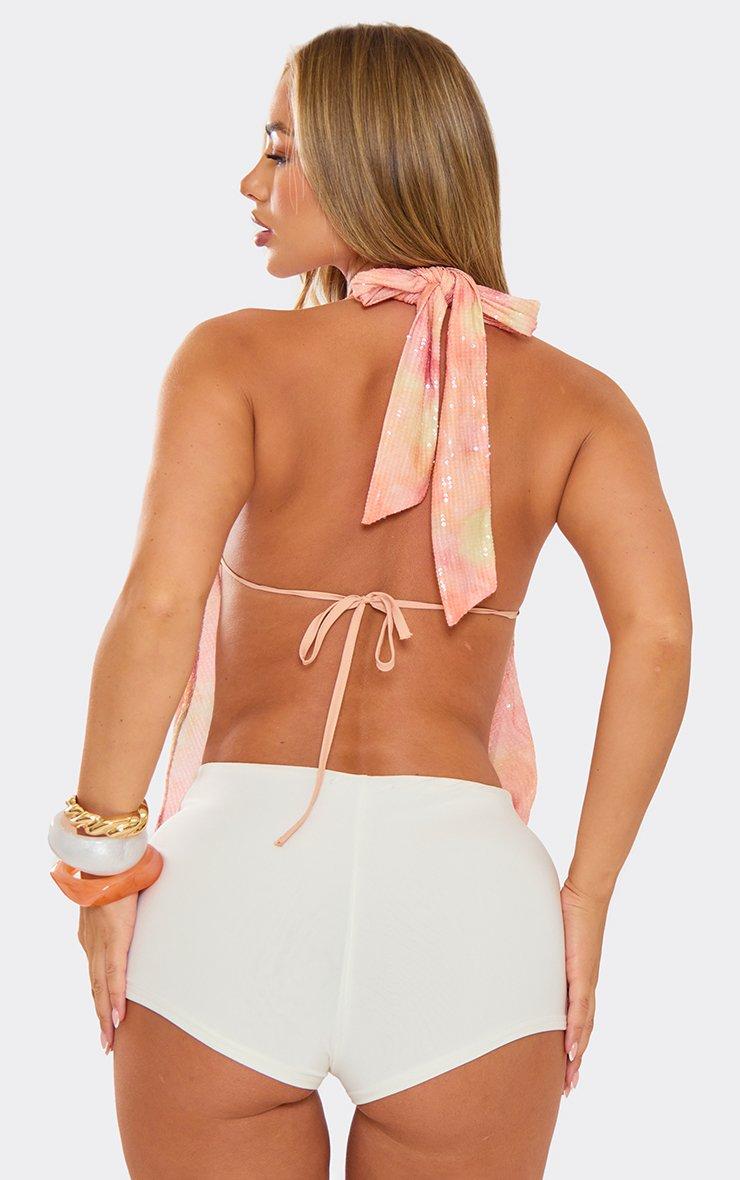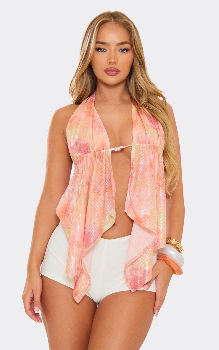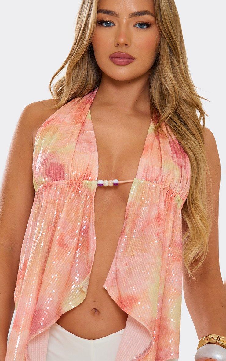 Halterneck Ruffle Split Hem Front Beaded Trim Detail Top In Multi Sequin