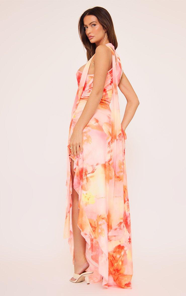One Shoulder Split Leg Detail Maxi Dress In Pink Floral Print