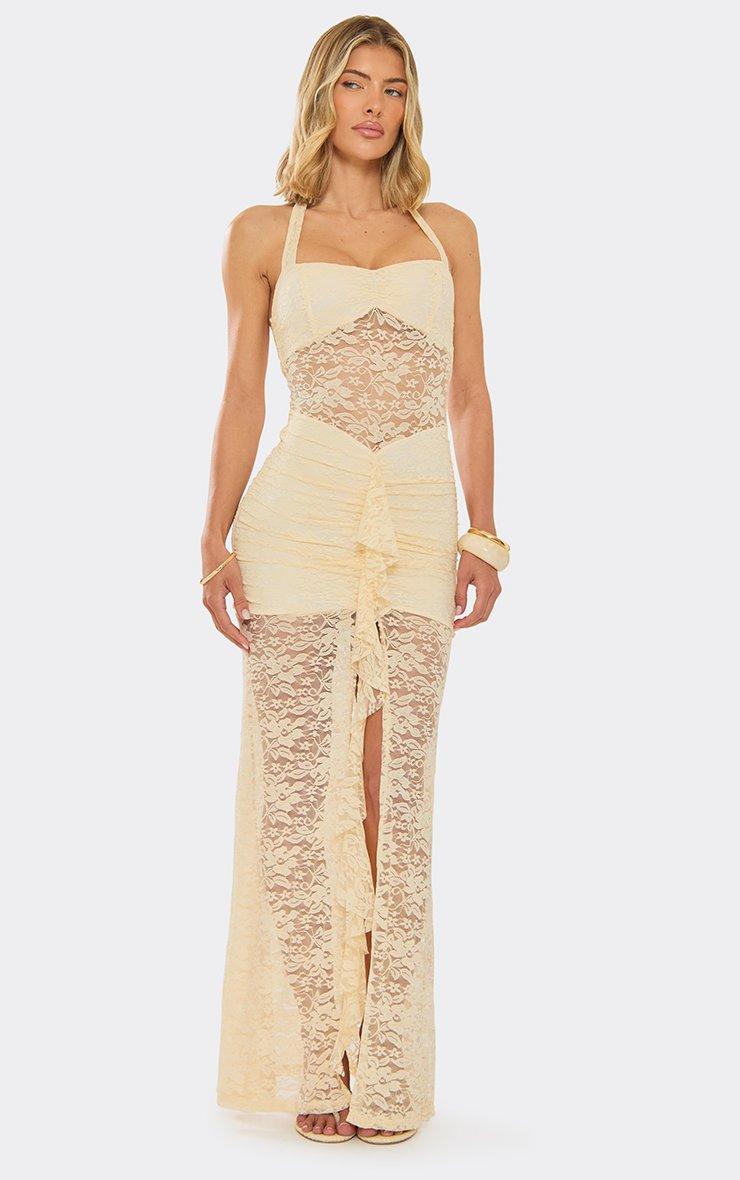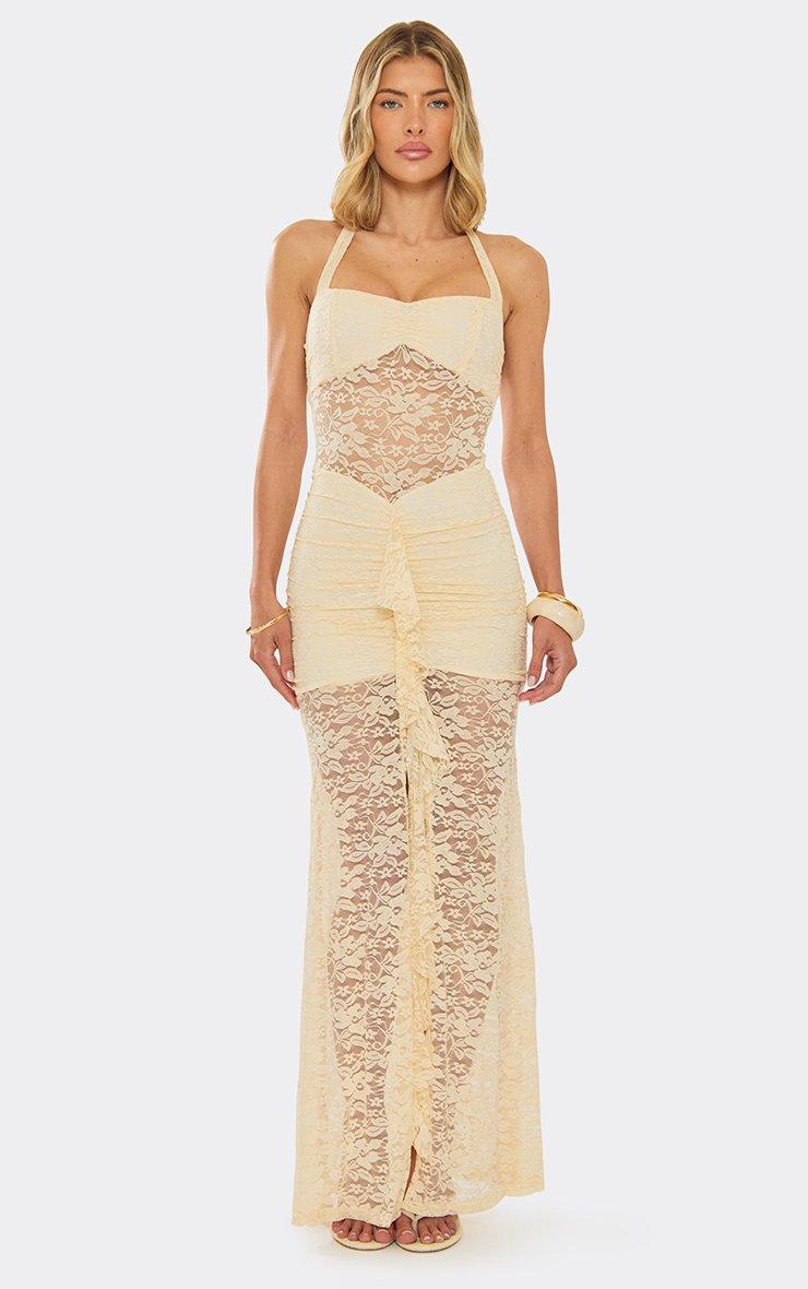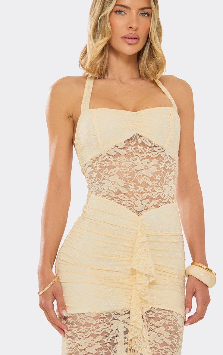 Halterneck Ruched Drape Front Contrast Lace Panel Maxi Dress In Cream