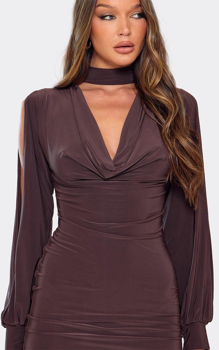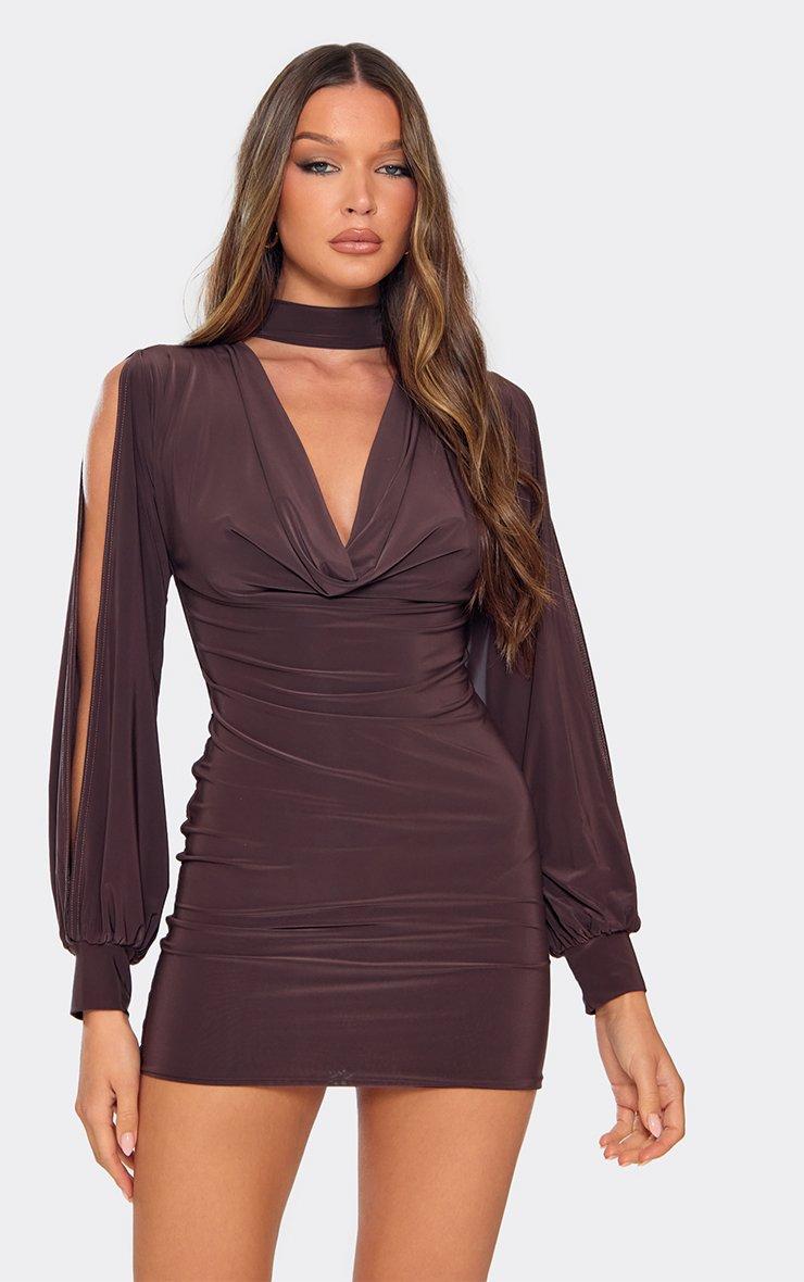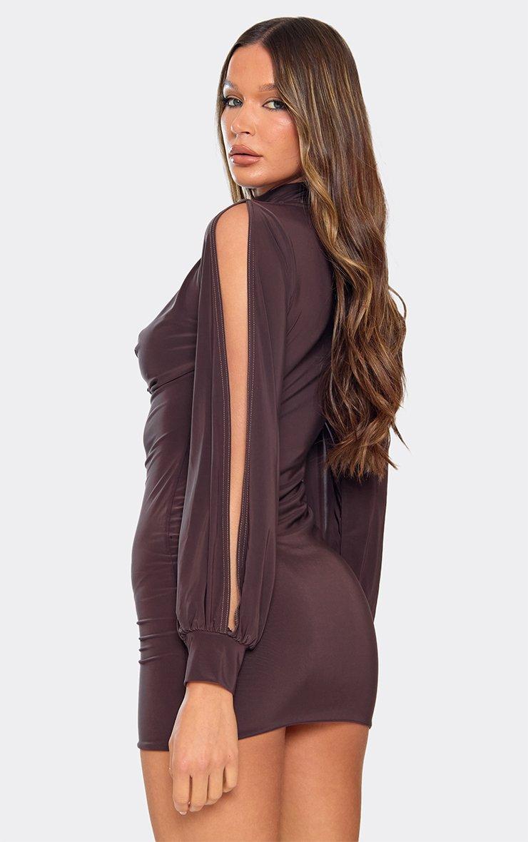 Choker Neck Long Sleeve Open Arm Detail Mini Dress In Chocolate Brown