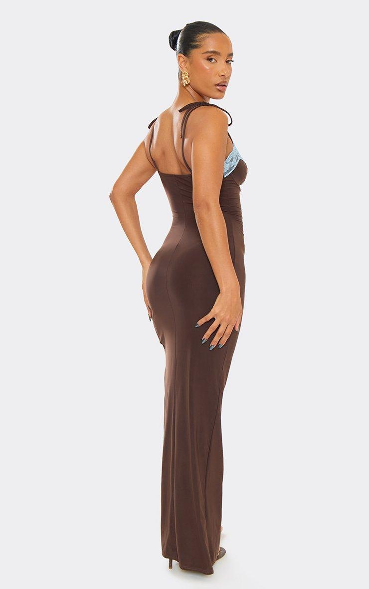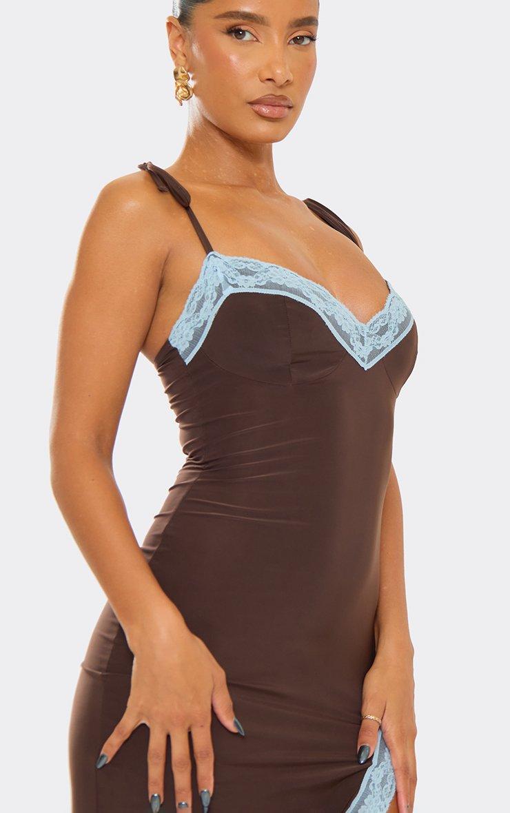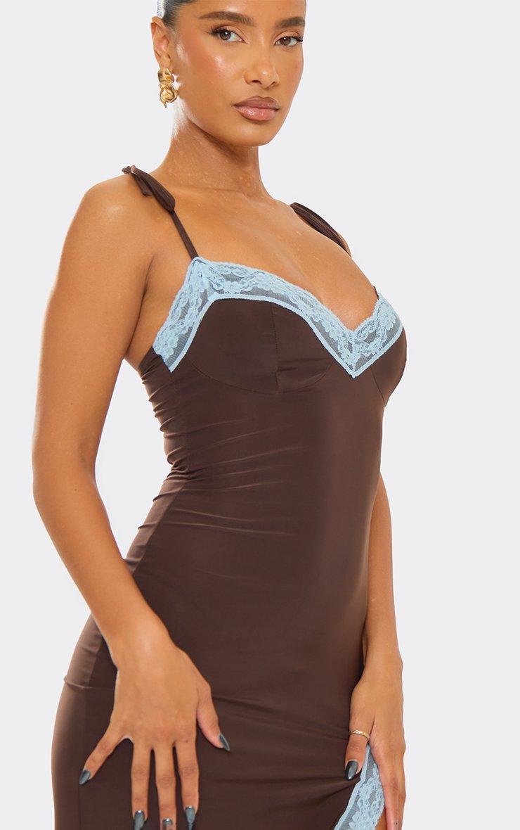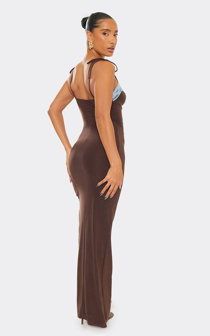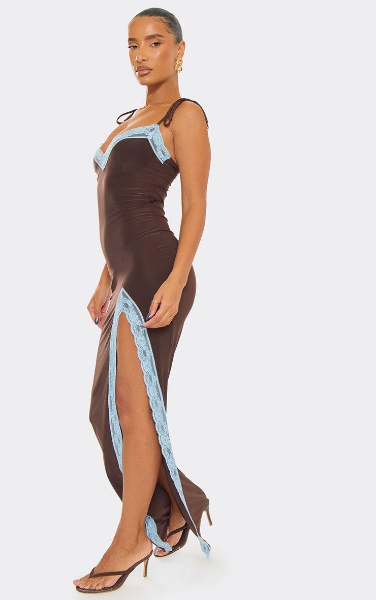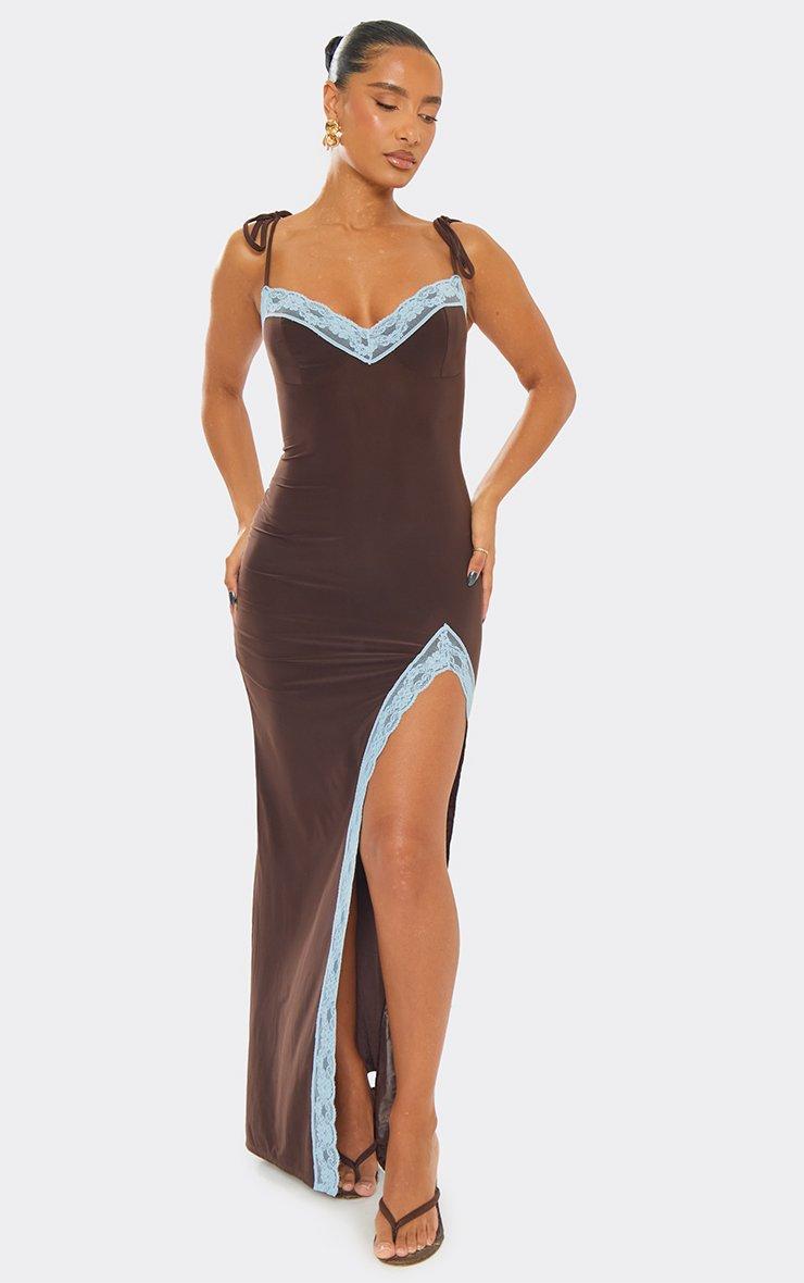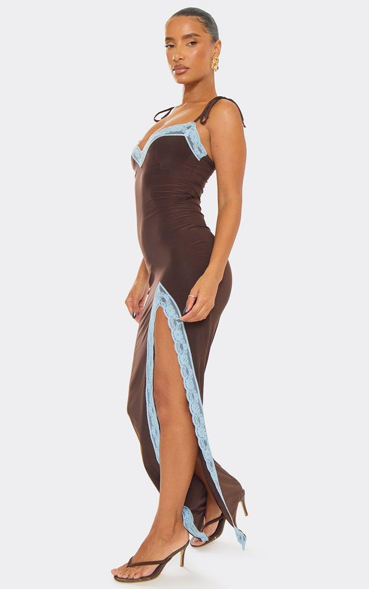 Strappy Contrast Lace Trim Side Split Maxi Dress In Brown