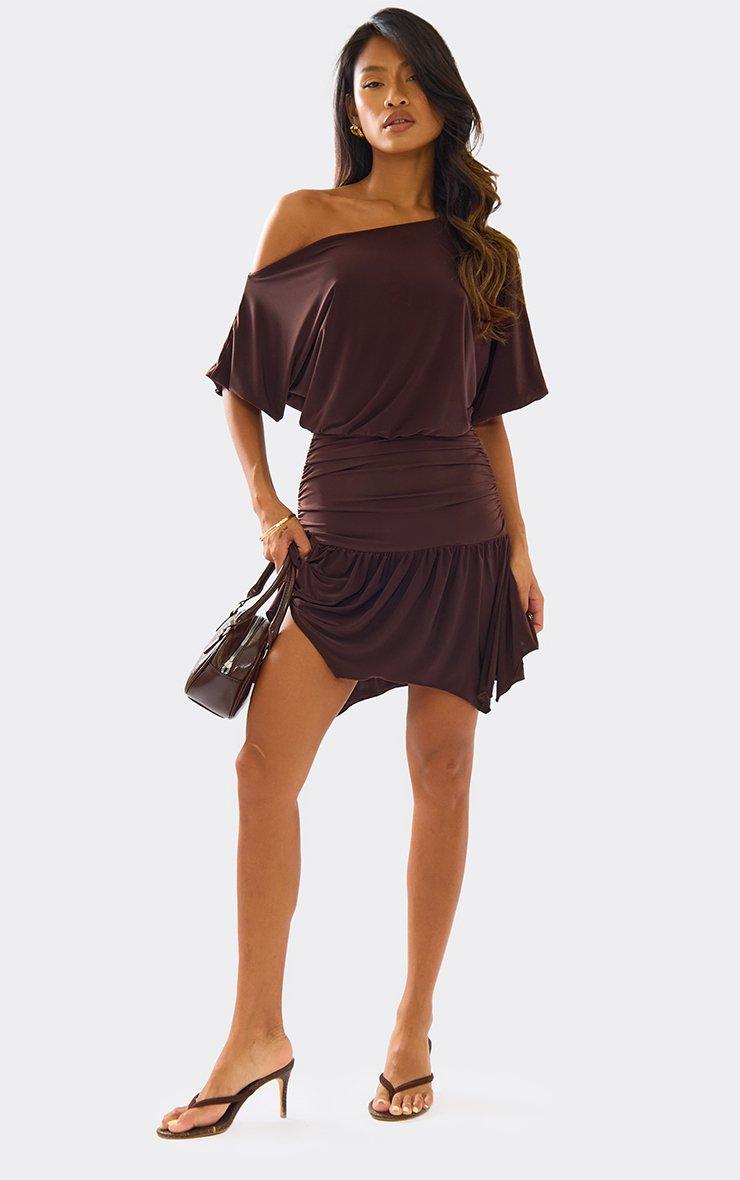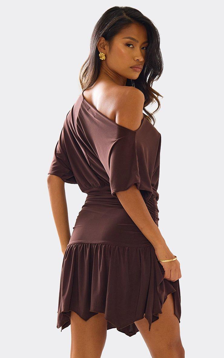 Asymmetric Slouched Sleeve Ruched Waist Skater Frill Mini Dress In Chocolate Brown