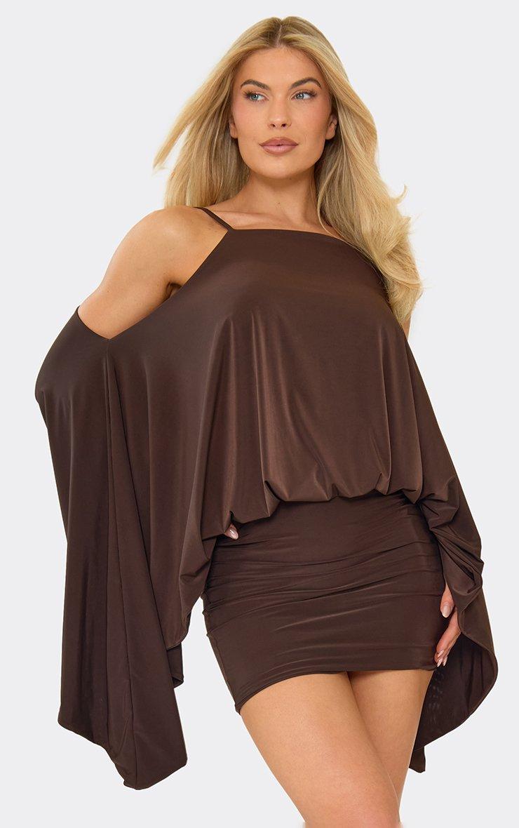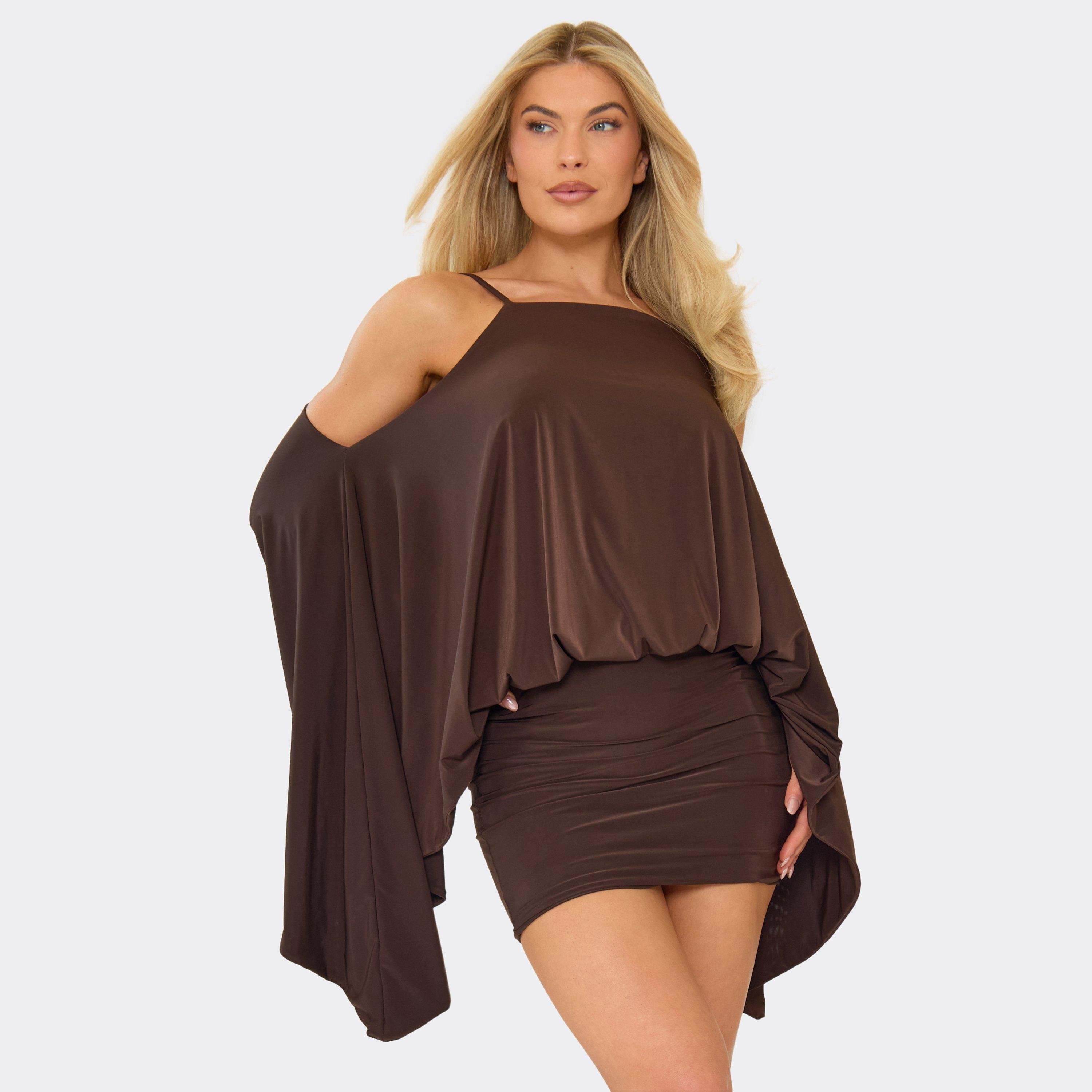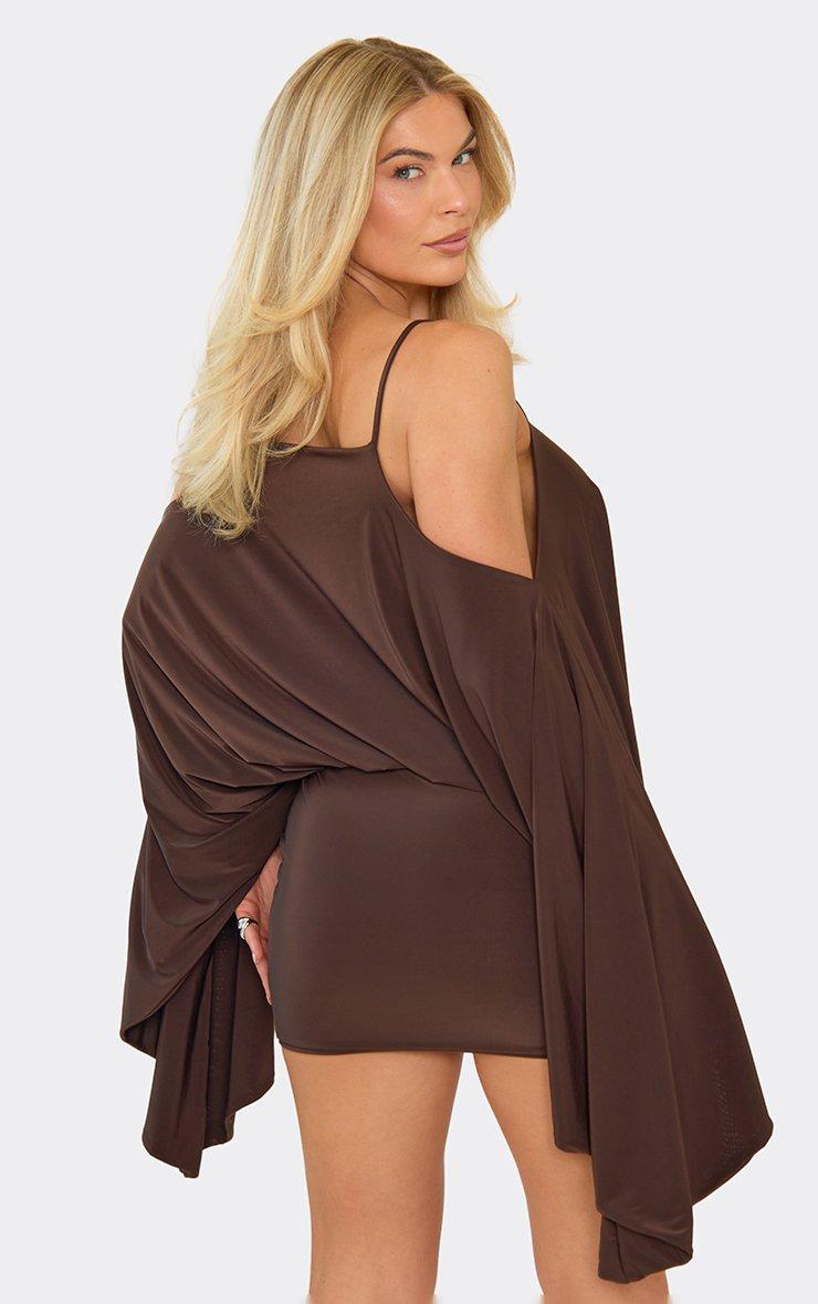 Strappy Off The Shoulder Long Sleeve Cape Mini Dress In Chocolate Brown