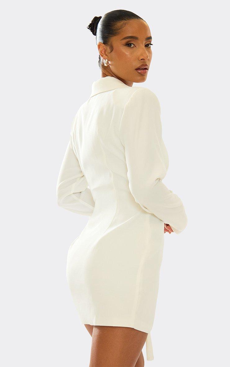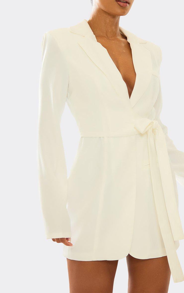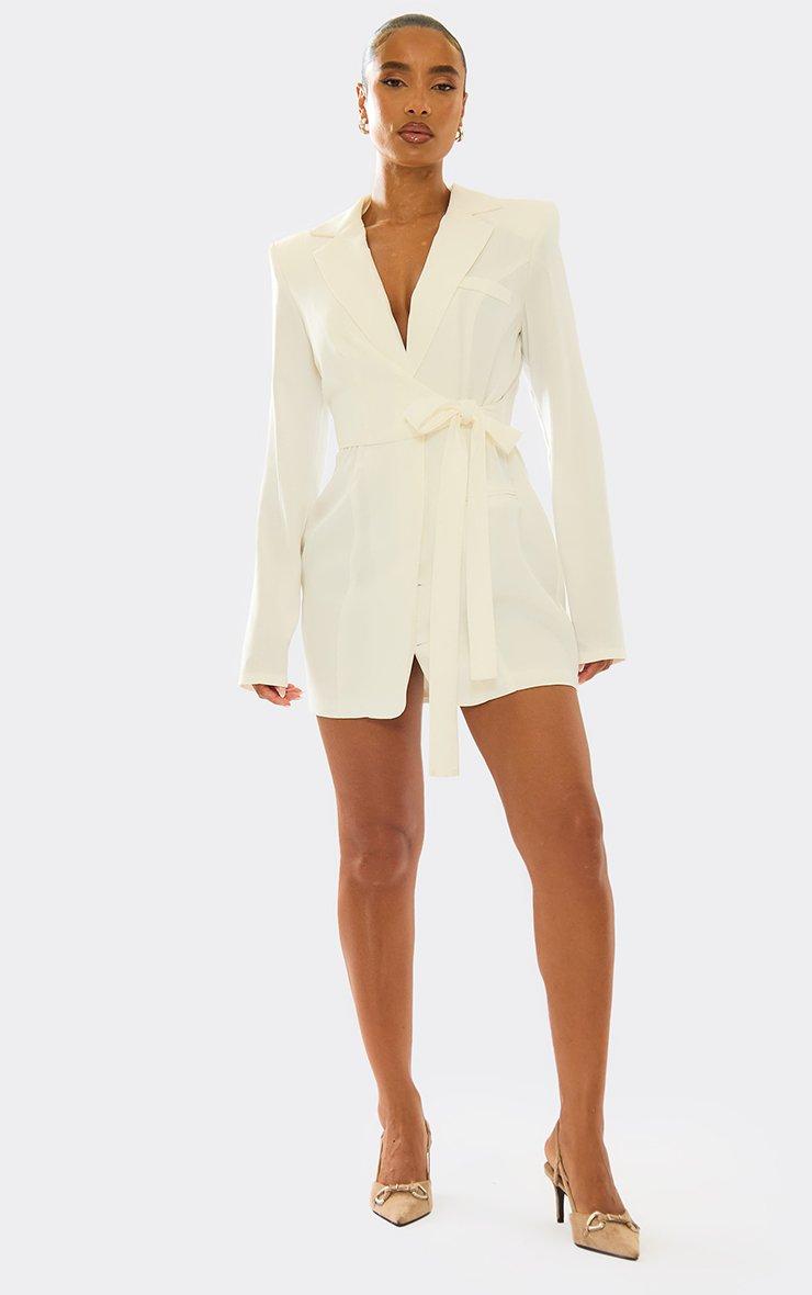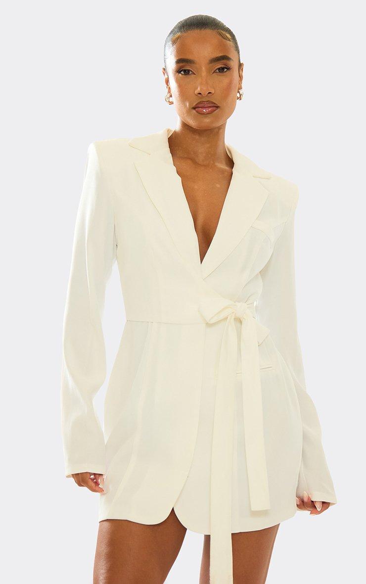 Long Sleeve Wrapover Belted Waist Blazer Dress In Cream