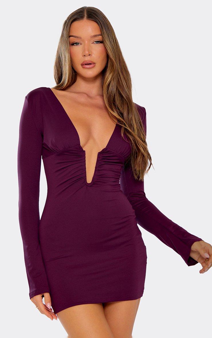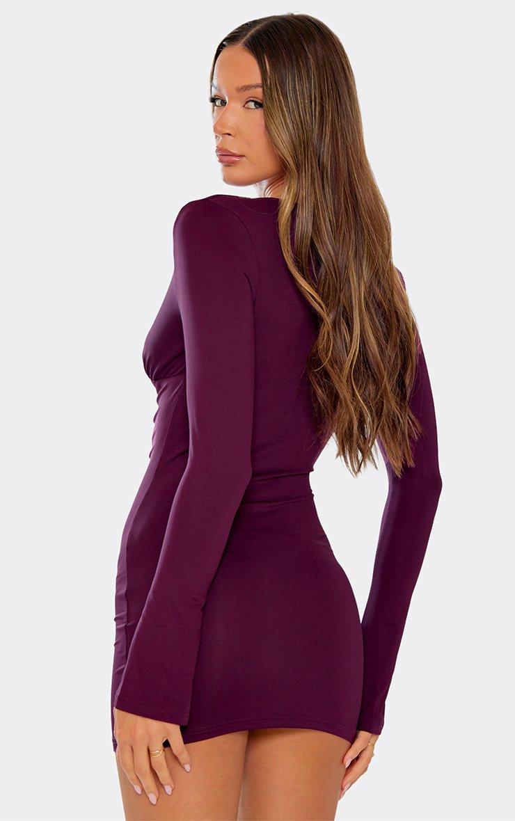 Long Sleeve Plunge Front Ruched Mini Dress In Plum