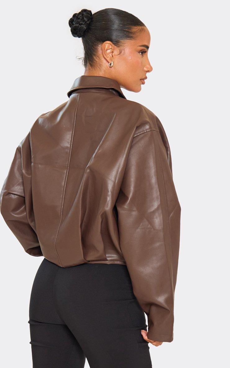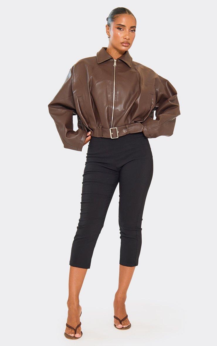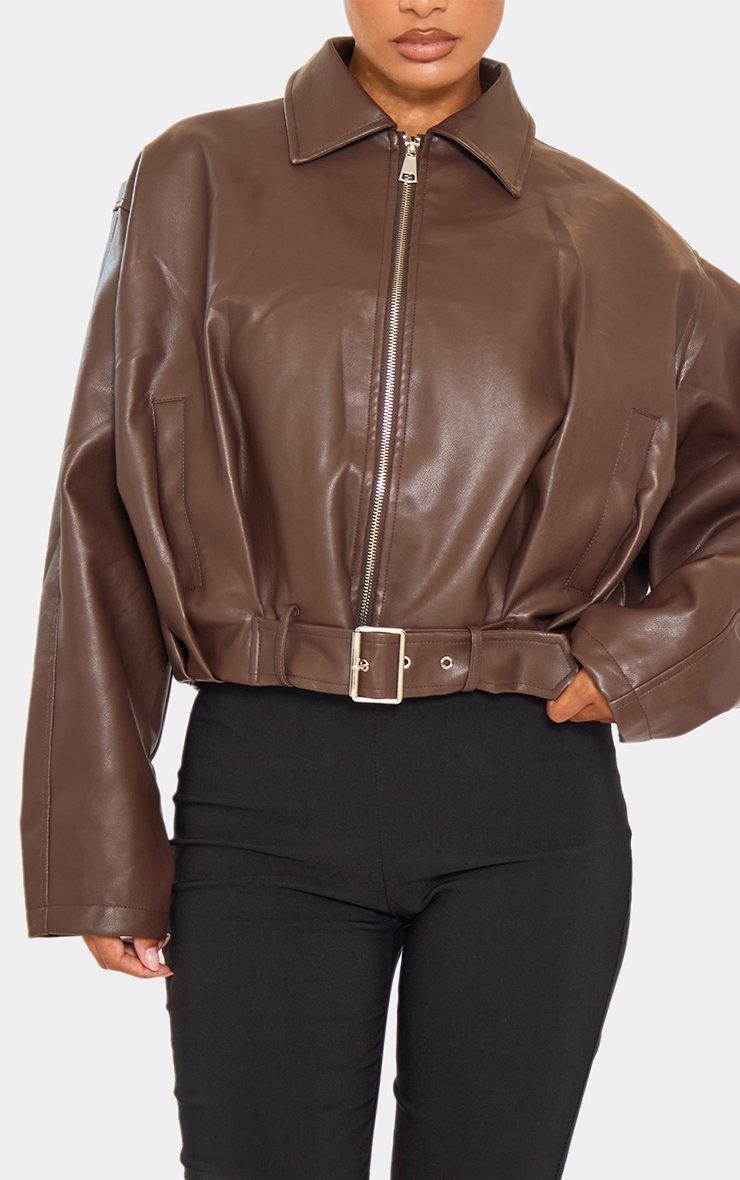 Collared Belt Detail Zip Up Jacket In Chocolate Brown Faux Leather