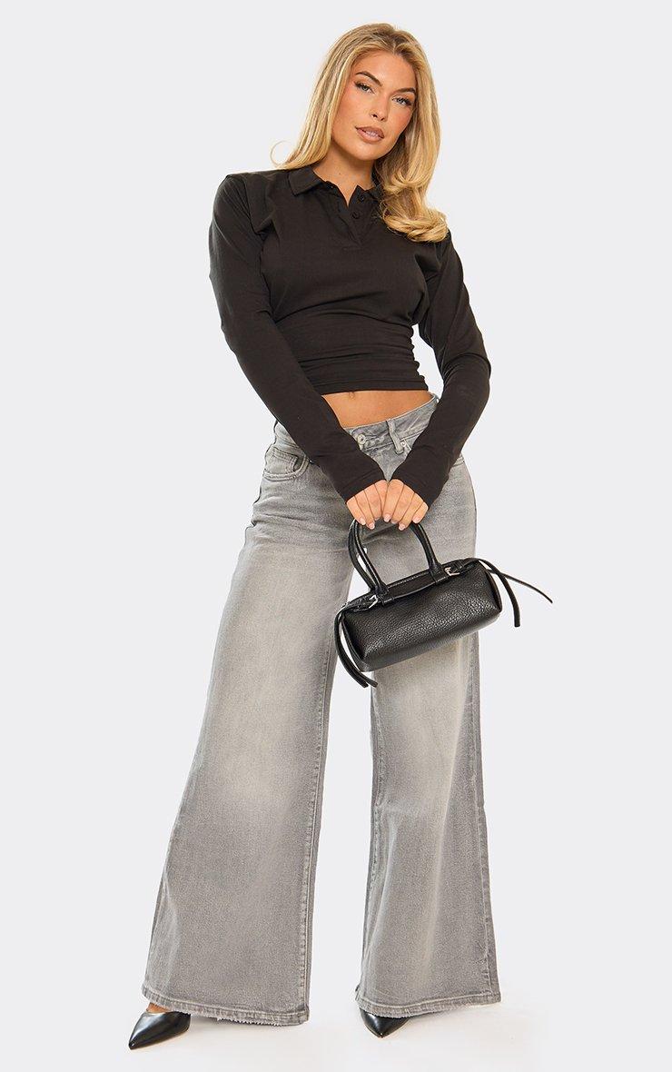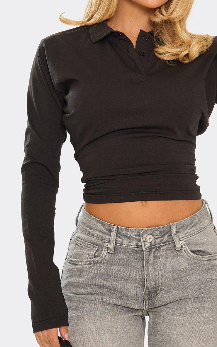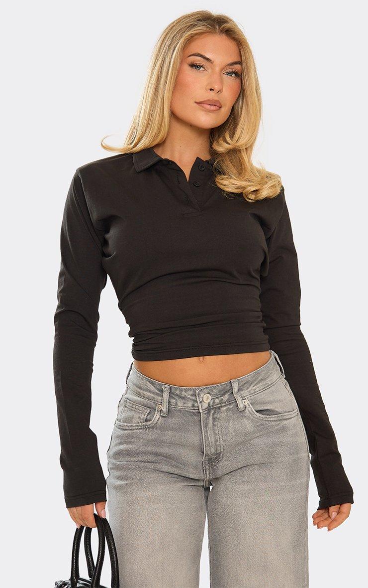 Long Sleeve Cinched Waist Button Down Polo Top In Black