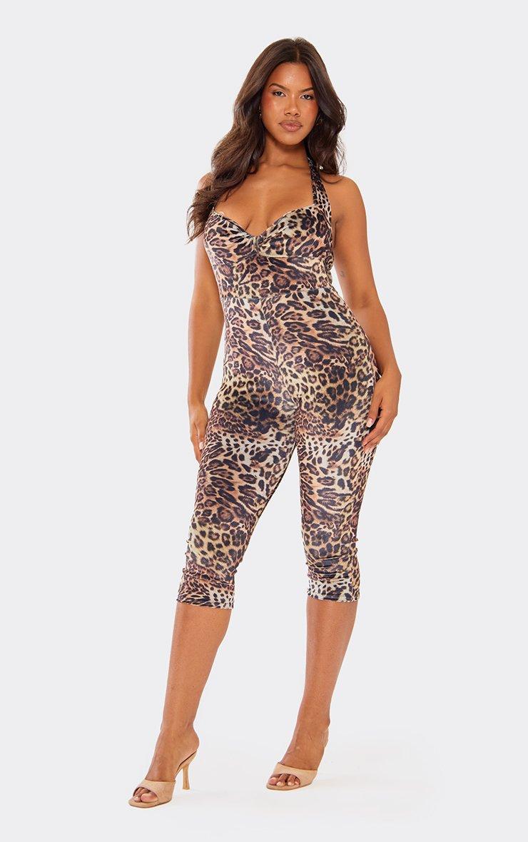 Halterneck Sweetheart Capri Jumpsuit In Brown Leopard Print