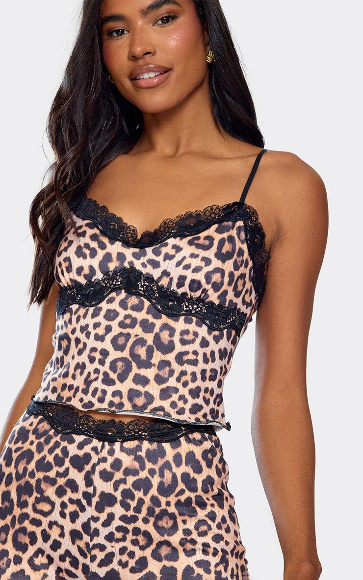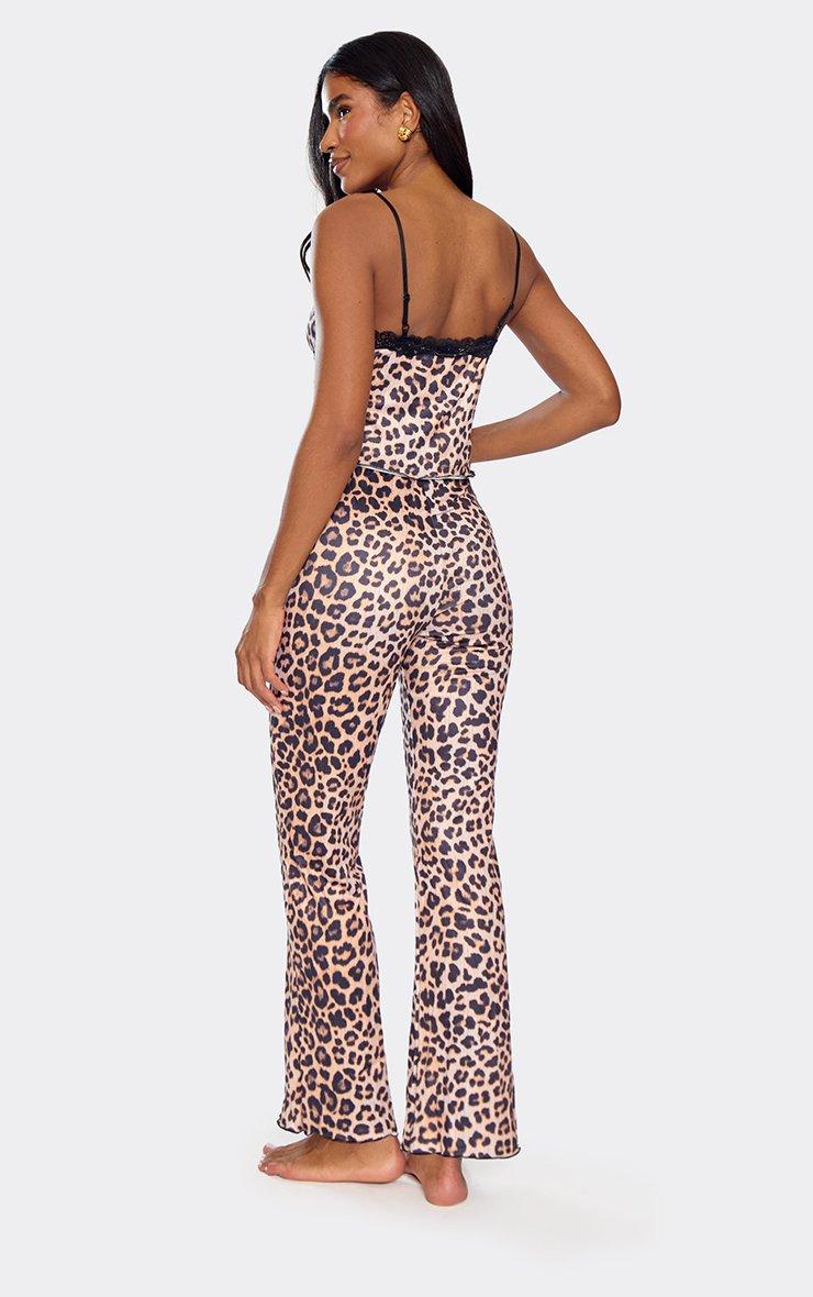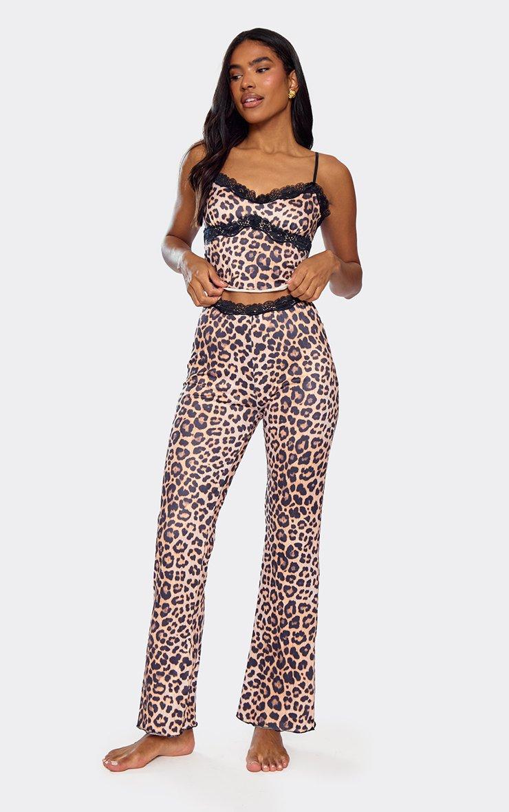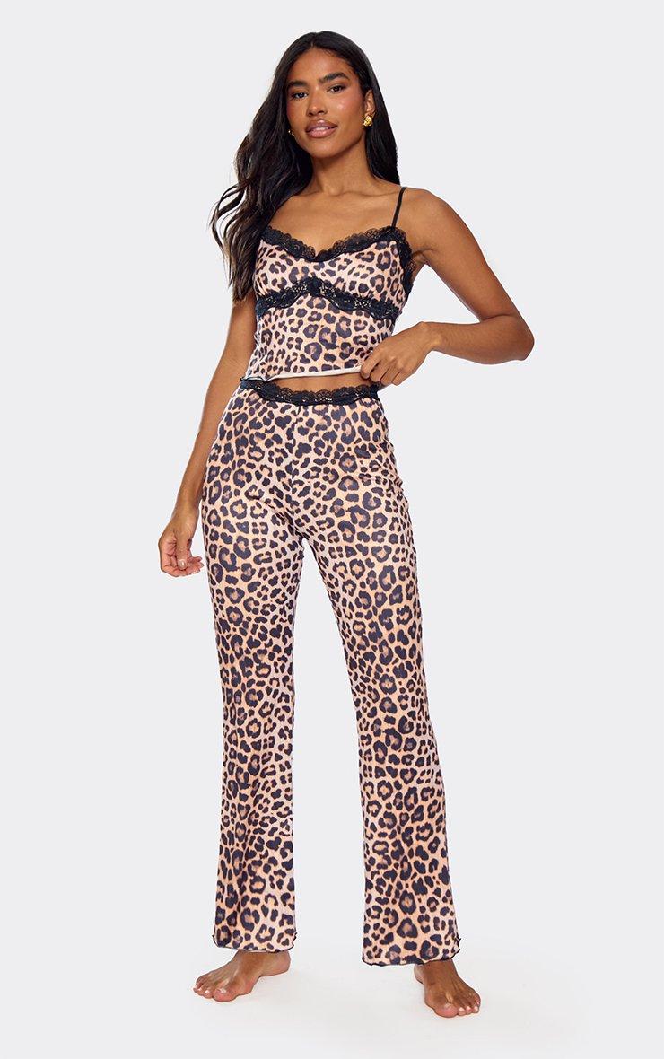 Strappy Contrast Lace Trim Cami Top And Trouser Set In Brown Leopard Print