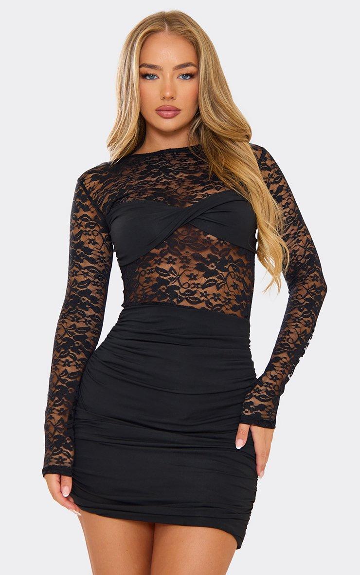 Long Sleeve Twist Bust Contrast Lace Panel Mini Dress In Black