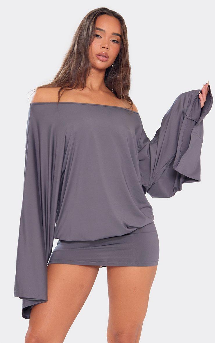 Bardot Wide Sleeve Blouson Detail Mini Dress In Charcoal Grey