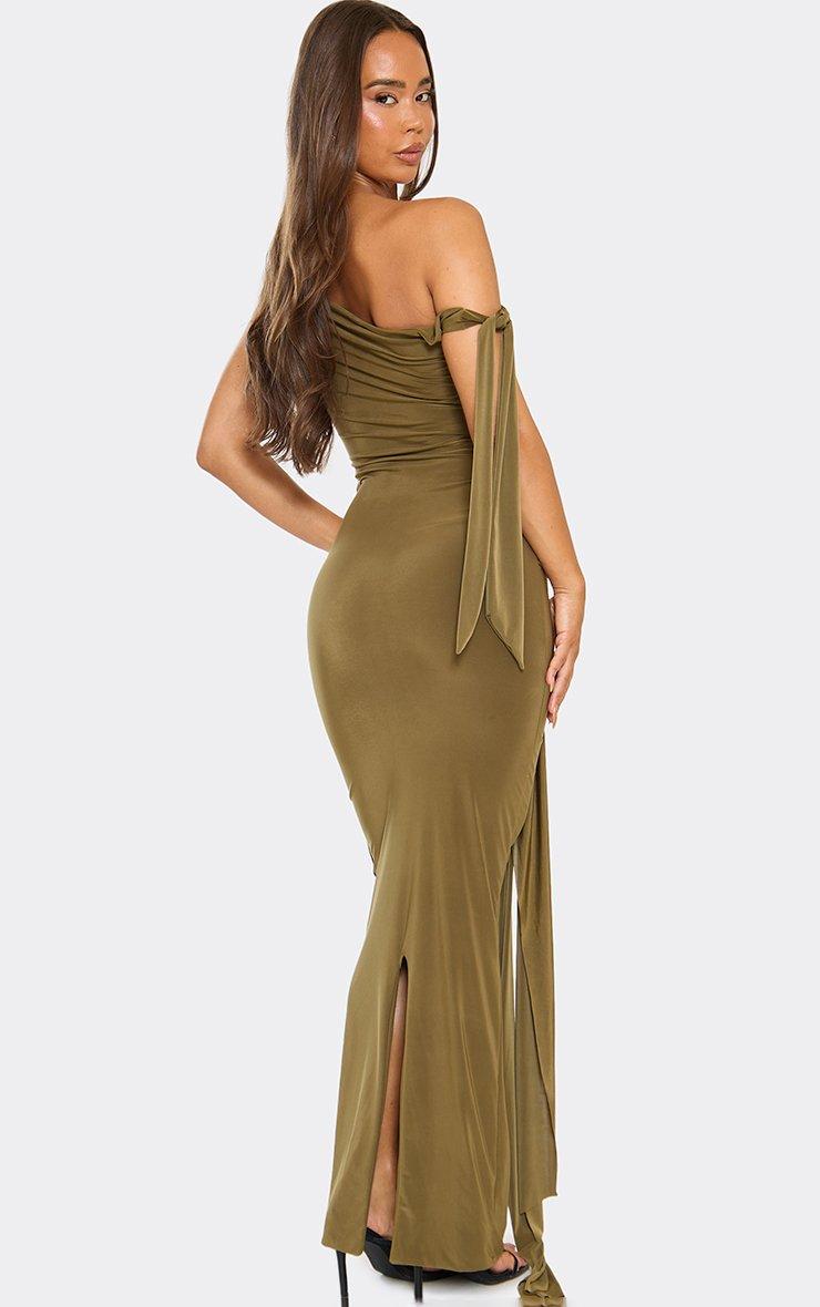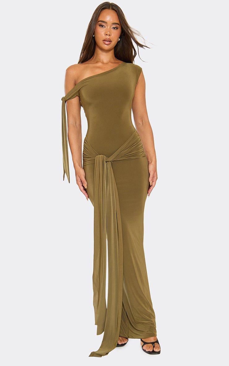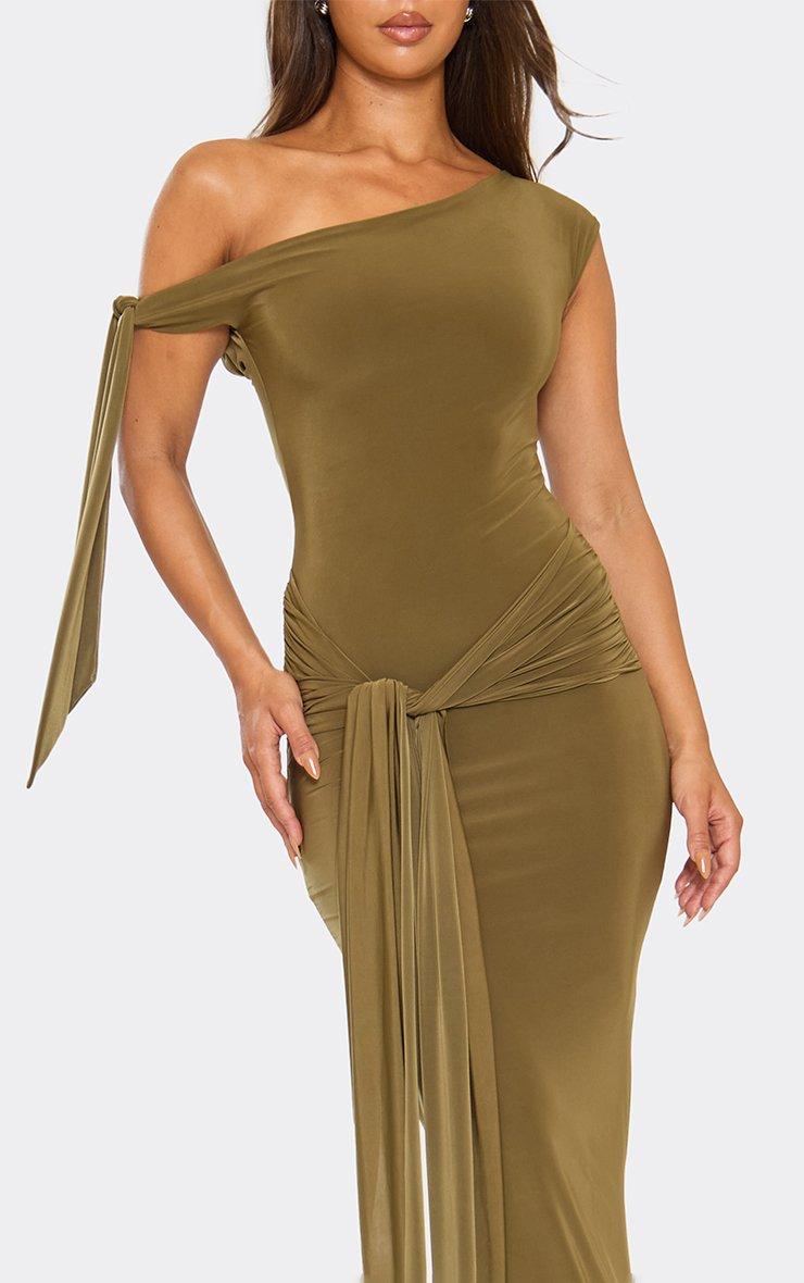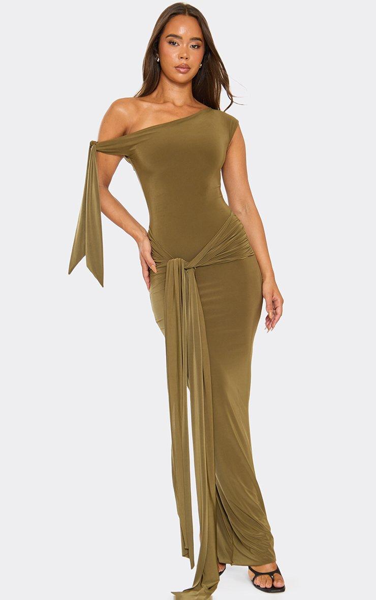 Asymmetric Tie Sleeve Detail Maxi Dress In Khaki Green