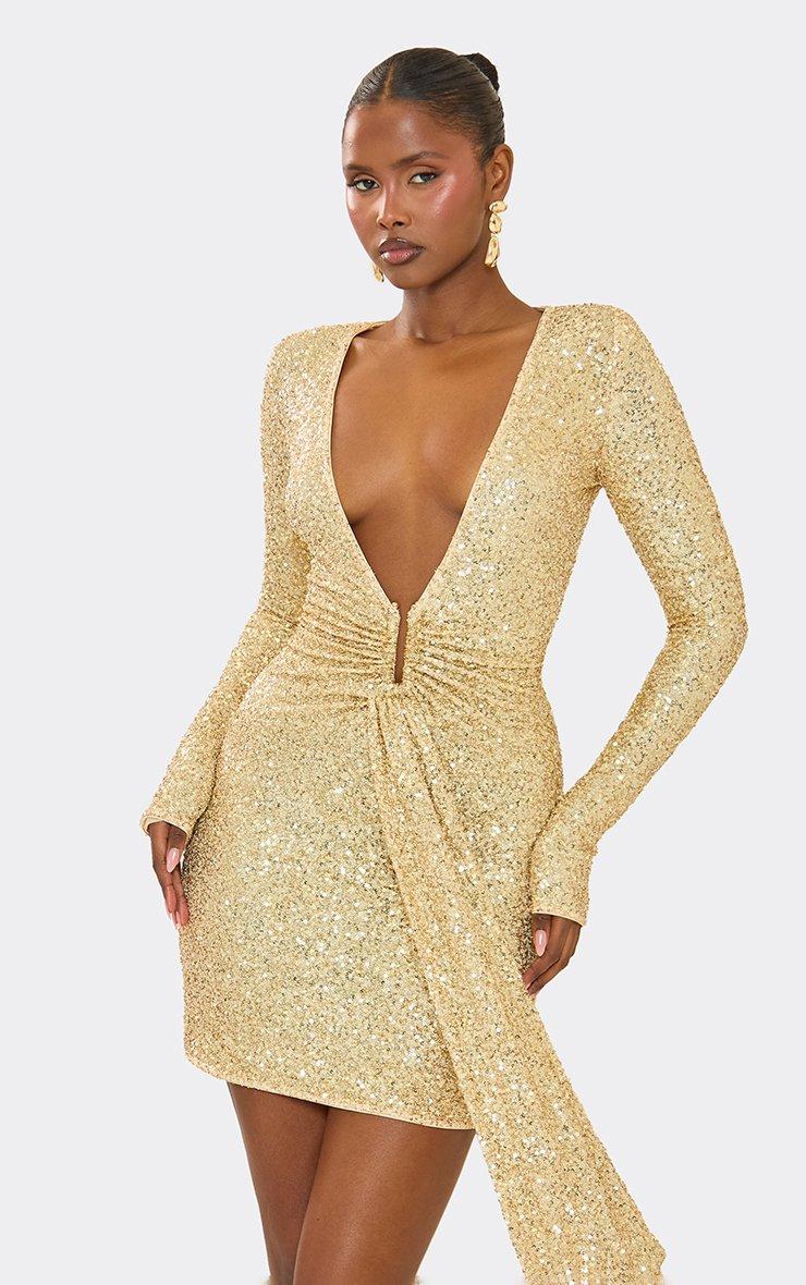 Long Sleeve Plunge Front Draped Detail Mini Dress In Gold Sequin