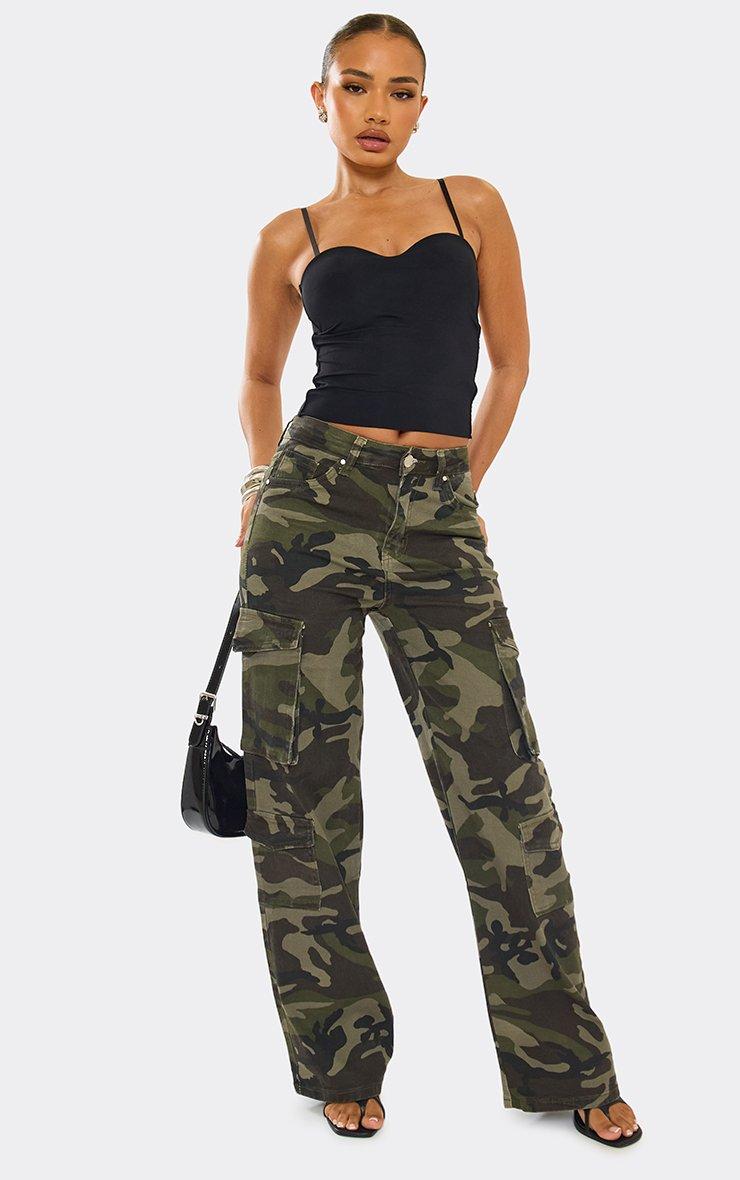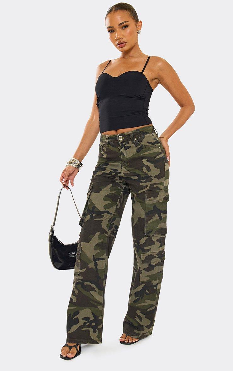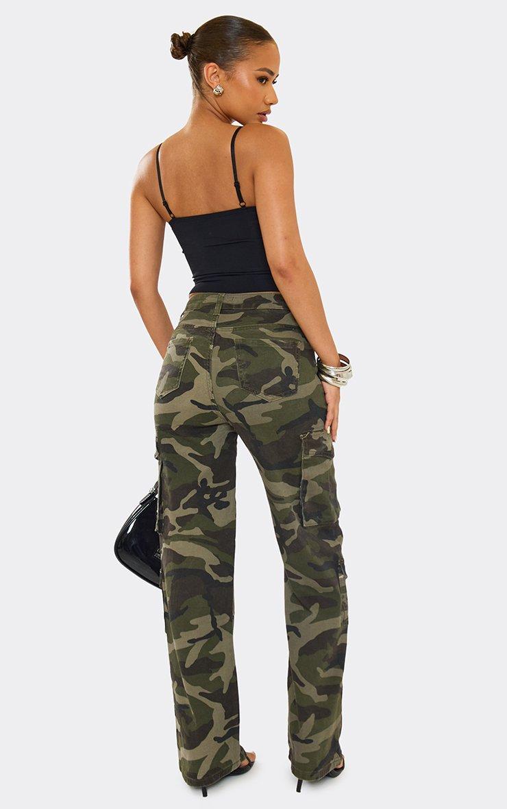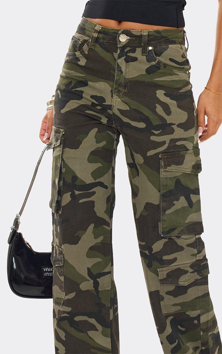 Mid Rise Cargo Detail Wide Leg Jeans In Khaki Camo Print Denim