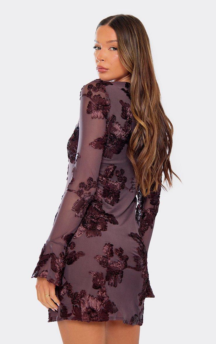Long Frill Sleeve Mini Dress In Chocolate Brown Floral Print Textured