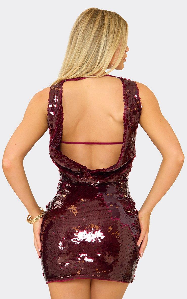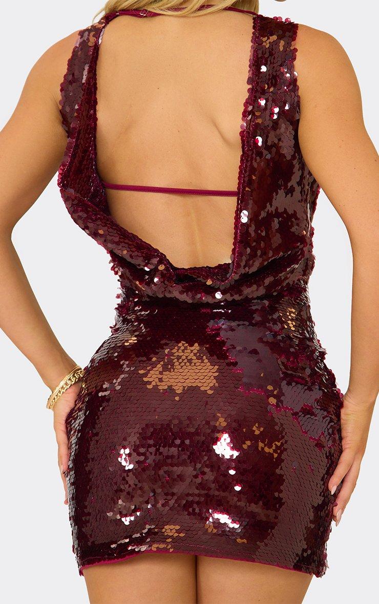 Racer Neck Draped Back Mini Dress In Burgundy Sequin