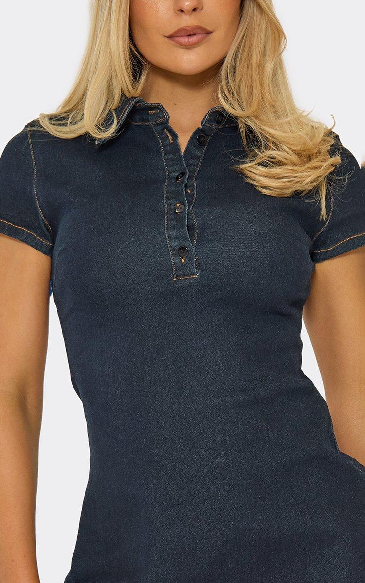 Short Sleeve Collared Button Detail Skater Mini Dress In Indigo Denim