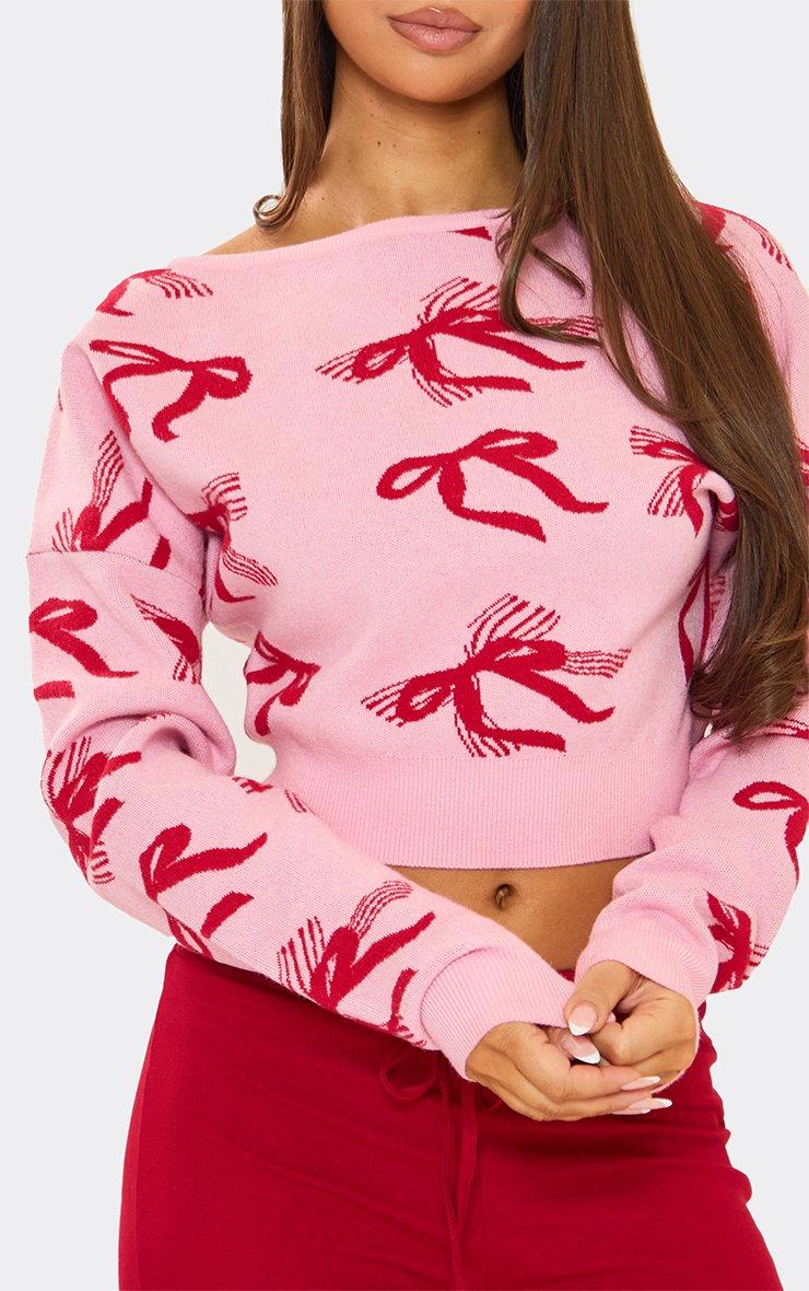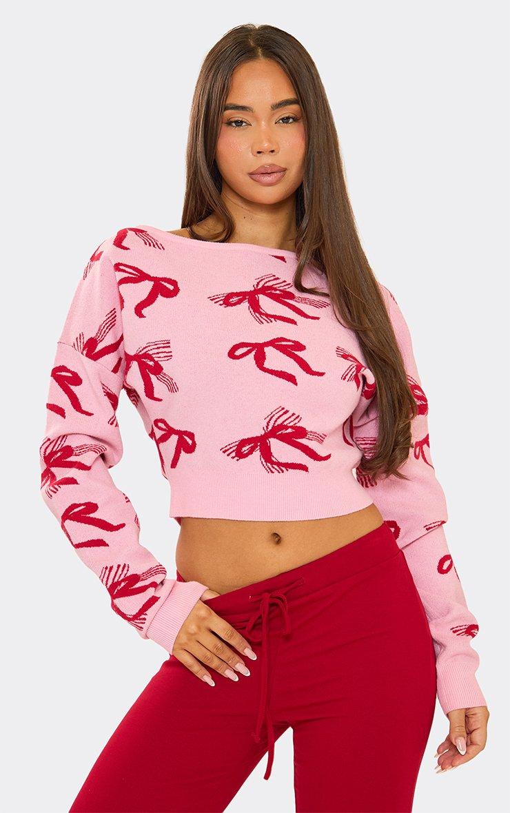 Off The Shoulder Bow Detail Christmas Jumper In Pink Knit