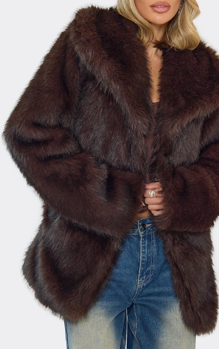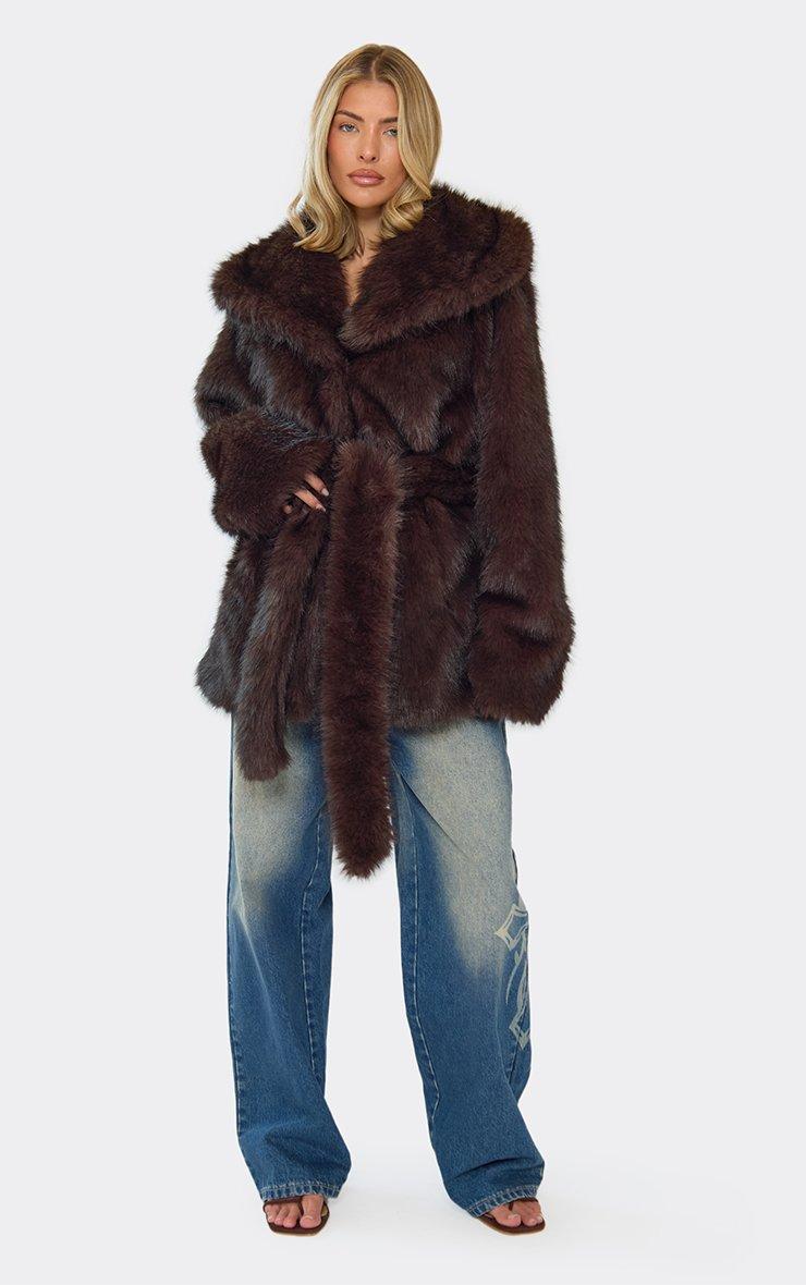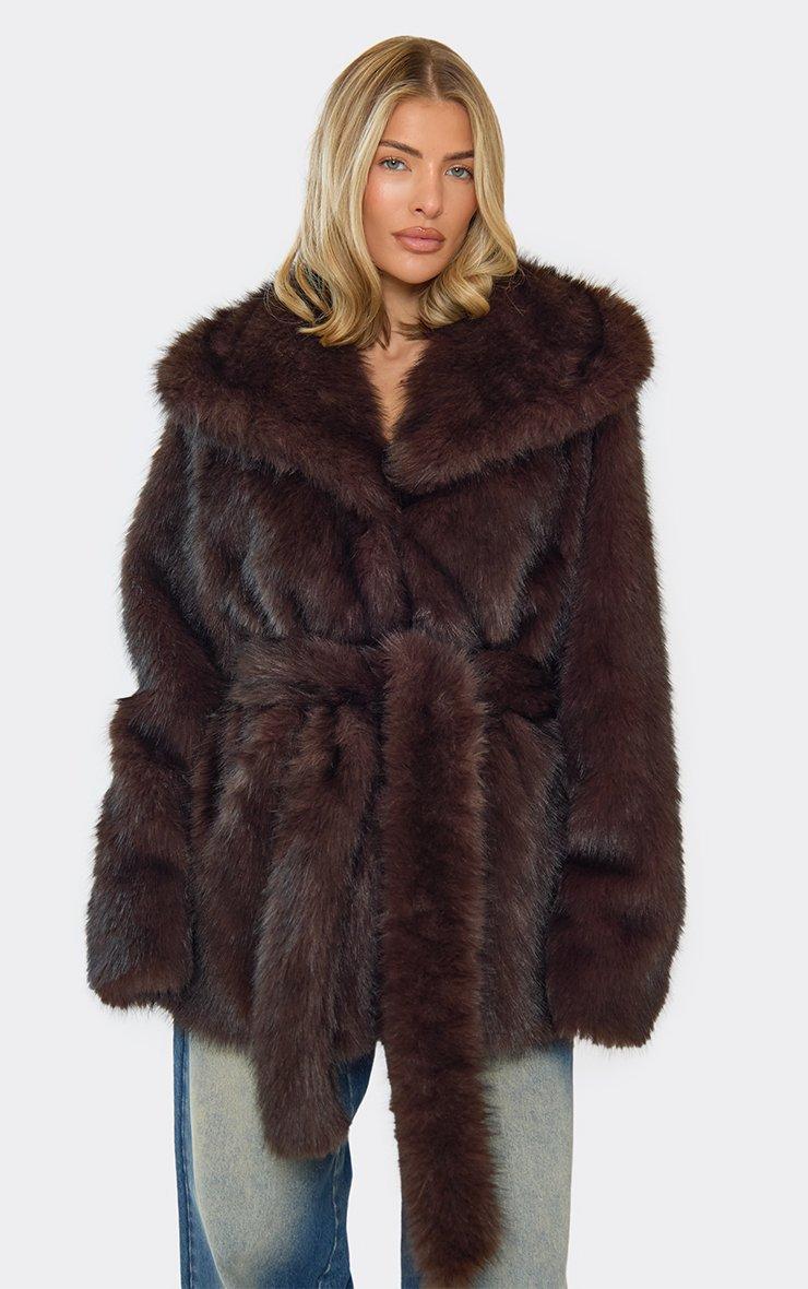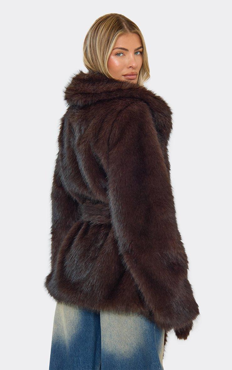 Oversized Collar Tie Belt Waist Coat In Chocolate Brown Faux Fur