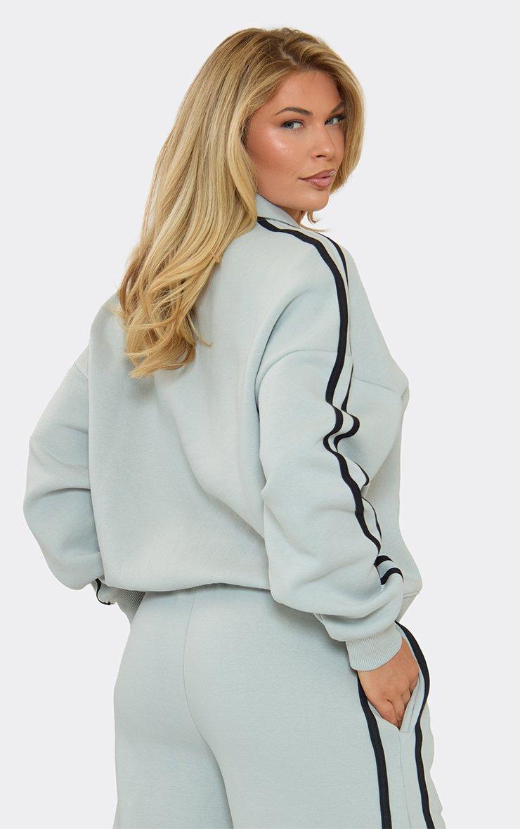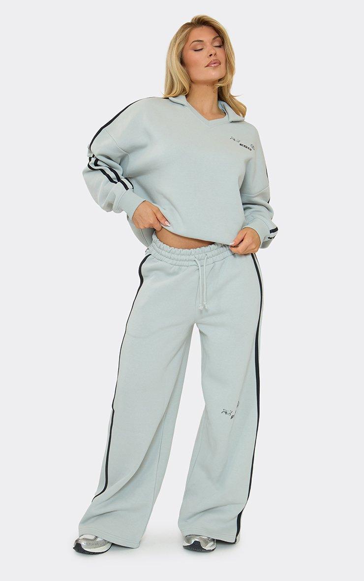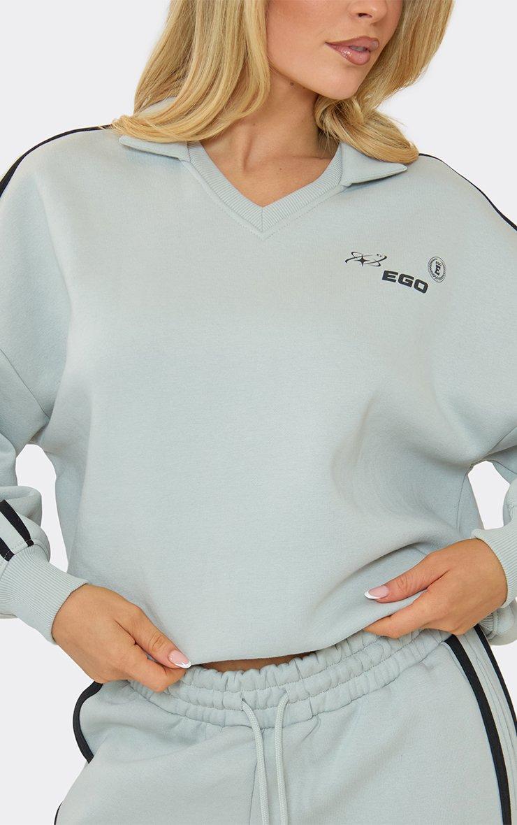 V Neck Collared Striped Ego Graphic Detail Sweatshirt In Light Grey