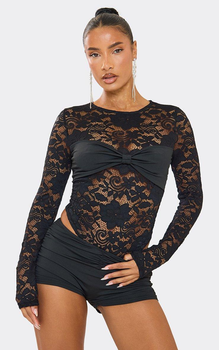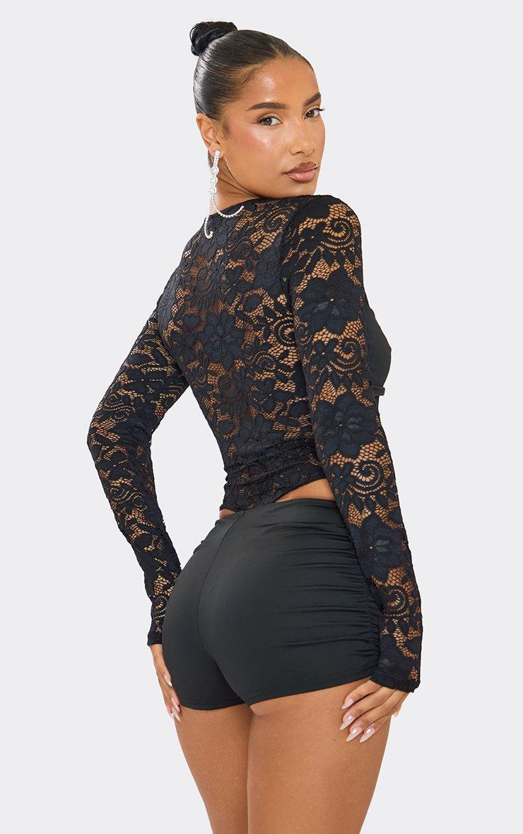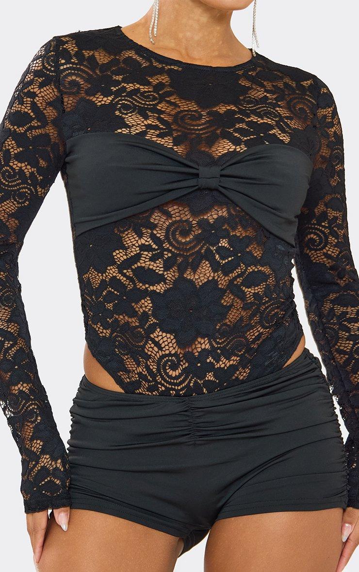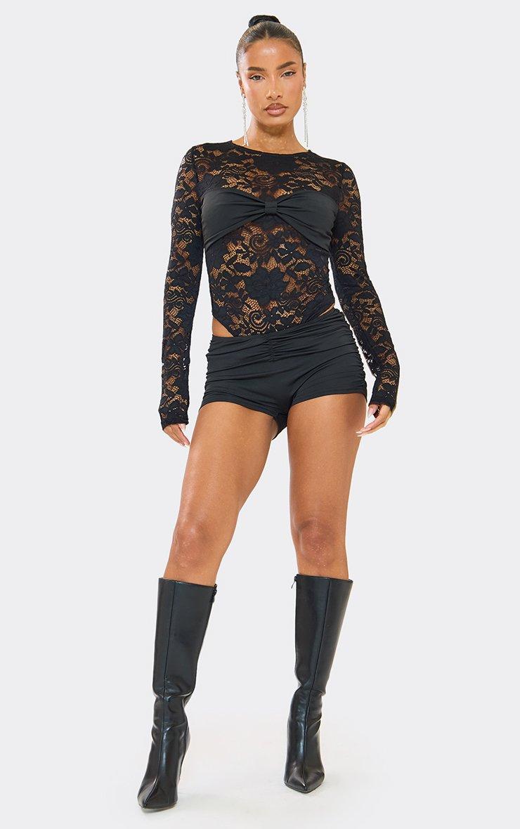 Long Sleeve Contrast Bust Detail Bodysuit And Low Rise Ruched Hot Pant Shorts Co-Ord Set In Black
