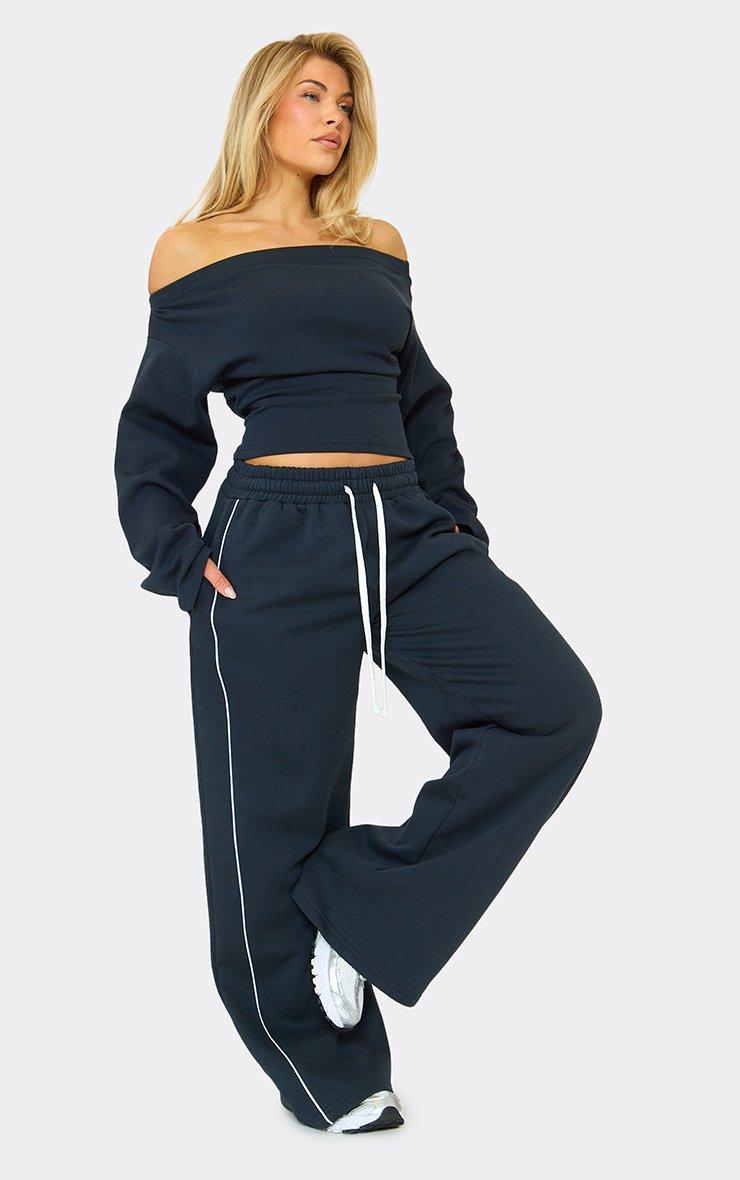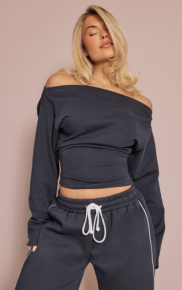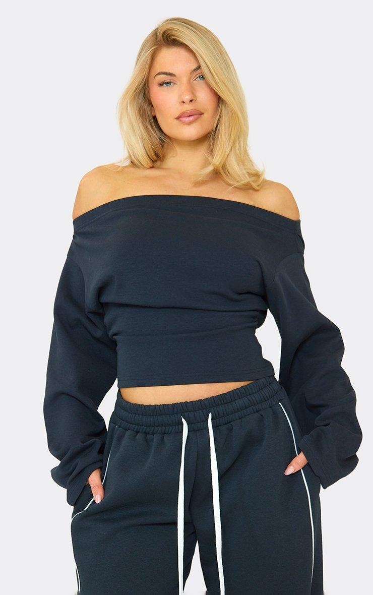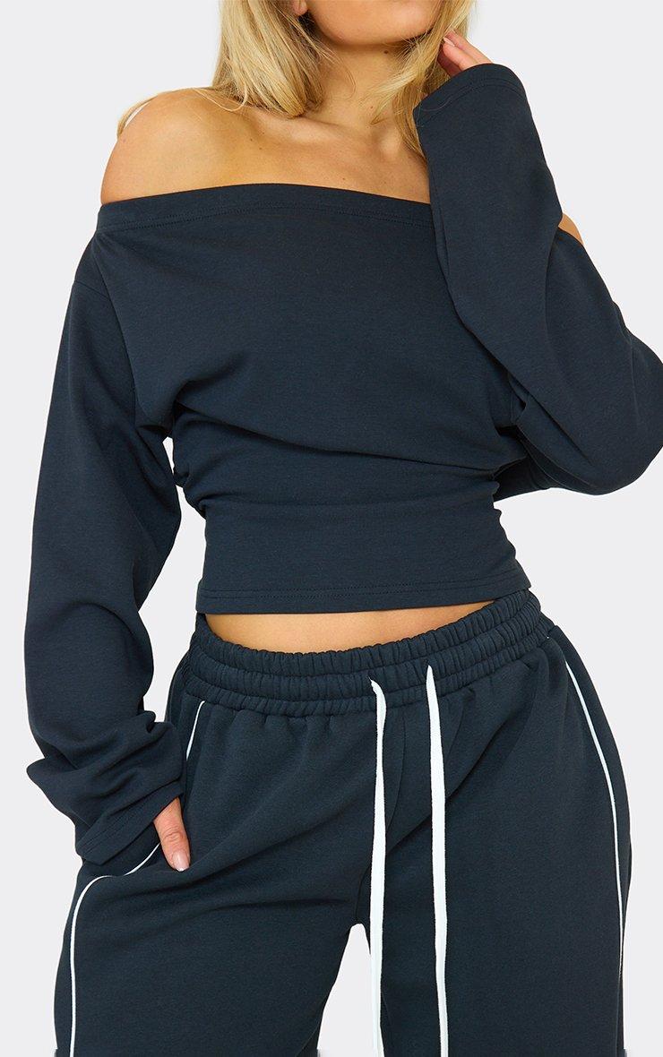 Long Sleeve Off The Shoulder Cinched Waist Top In Navy Blue
