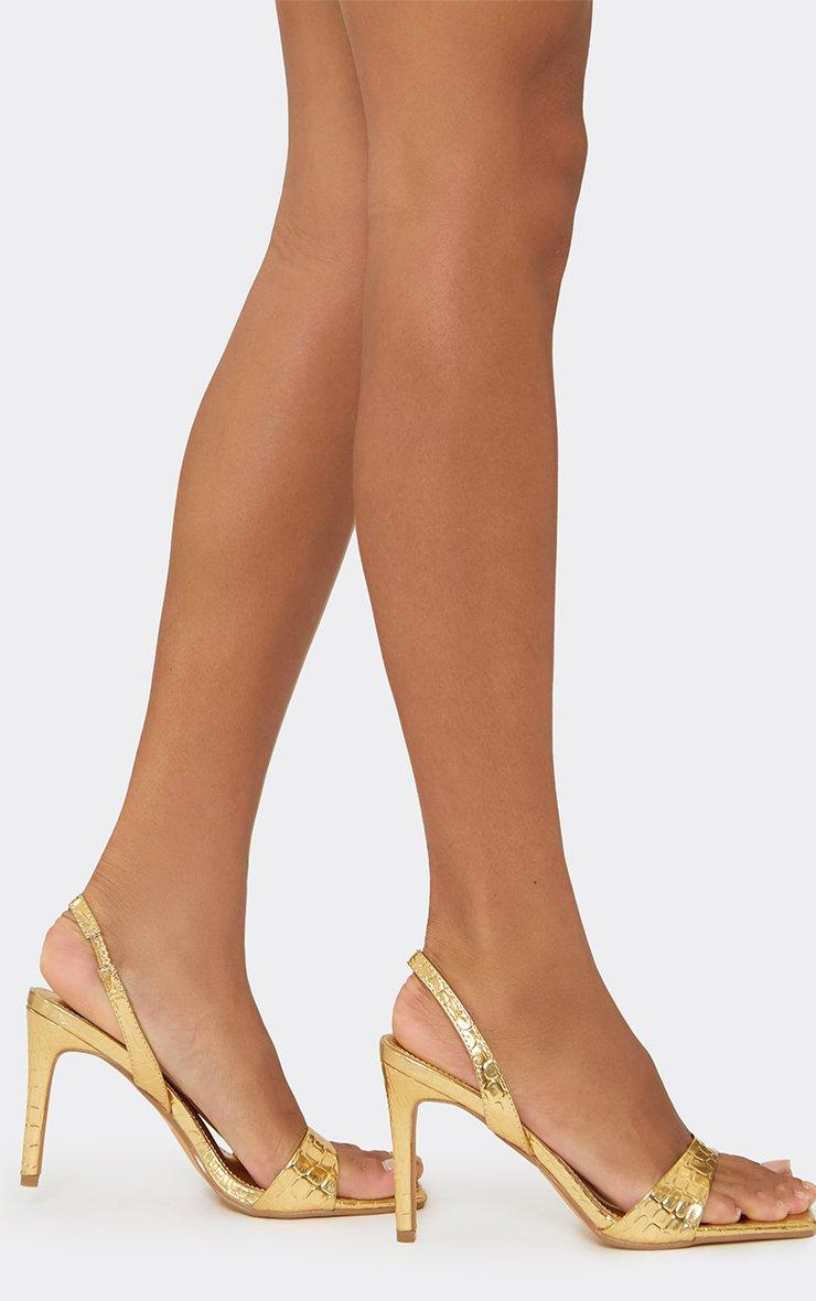 These heels are bringing the elegant vibes and they are perfect for styling. Featuring a gold croc print faux leather material, a square toe and a slingback stiletto heel design.