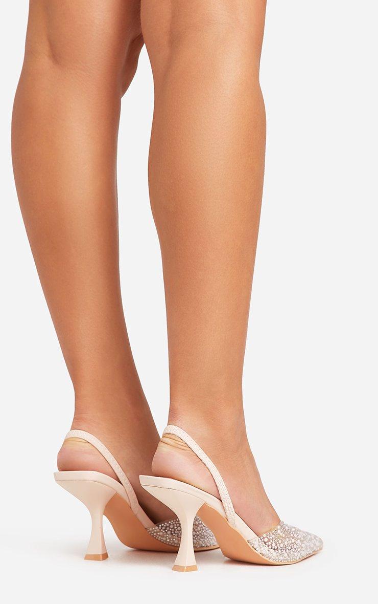 Girl, get yourself evening ready with new season EGO. Featuring a nude faux material, with diamante detailing, a clear perspex pointed toe, slingback strap and a court heel design.