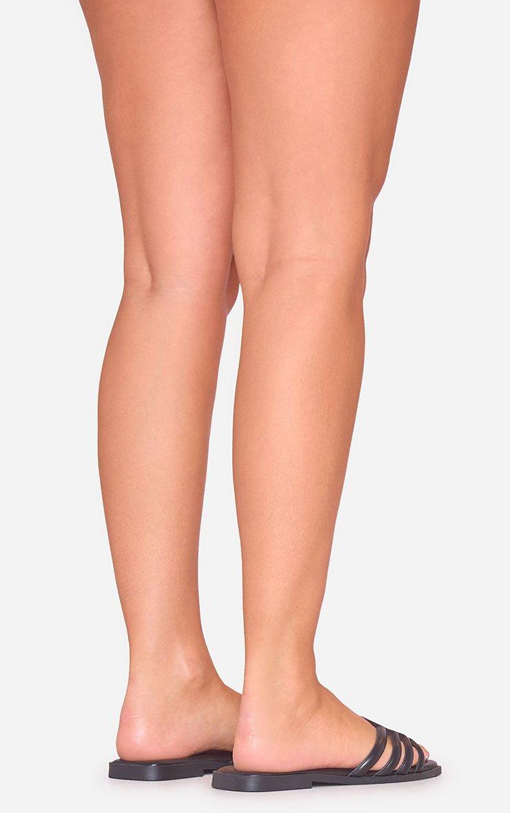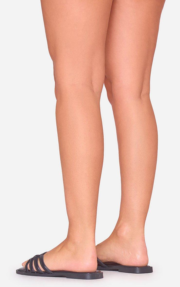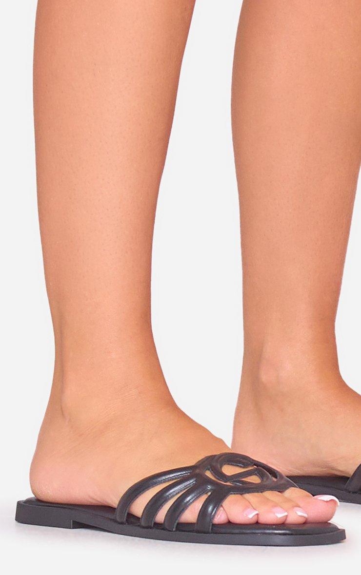 Stork Cut Out Strap Flat Slider Sandal In Black Faux Leather