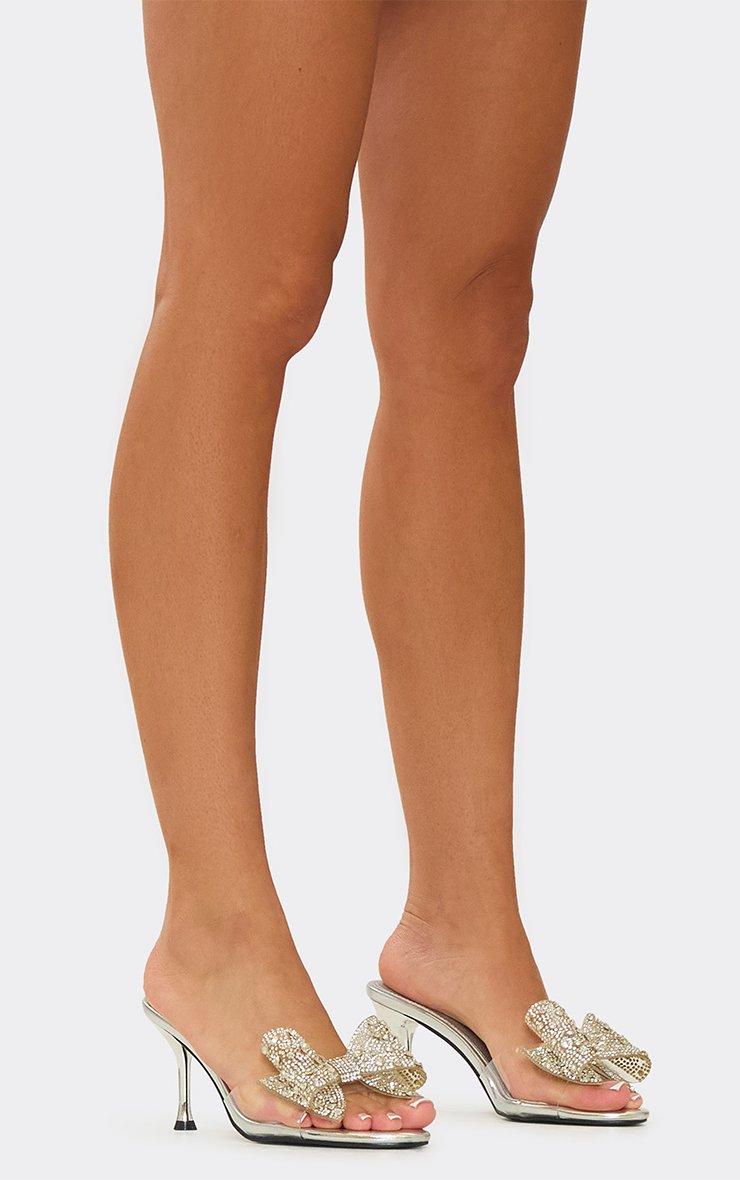 Cortese Perspex Strap Diamante Bow Detail Heel Mule In Silver Faux Leather