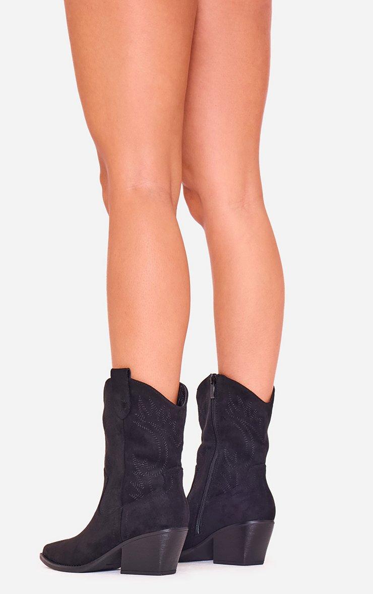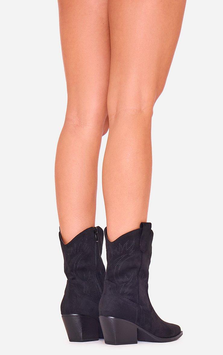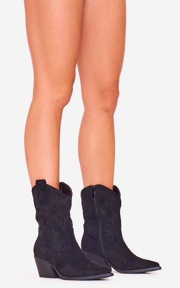 Foster Embroidered Detail Pointed Toe Western Cowboy Ankle Boot In Black Faux Suede