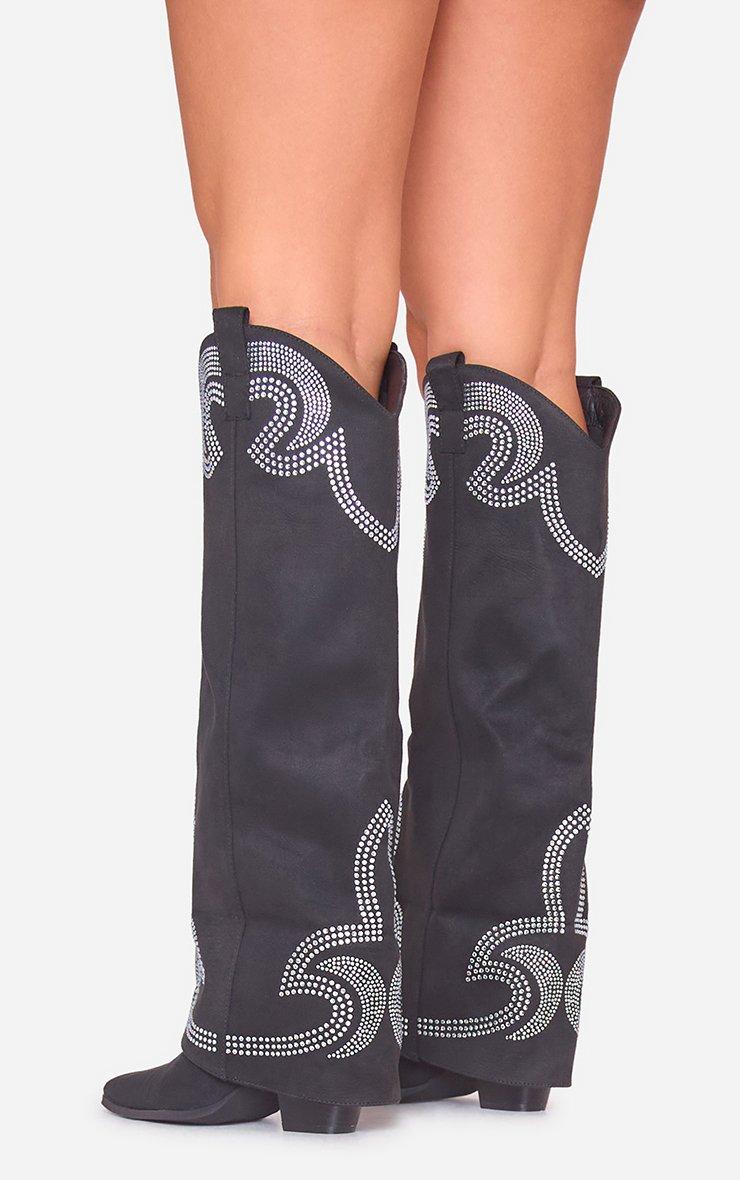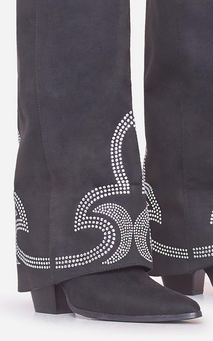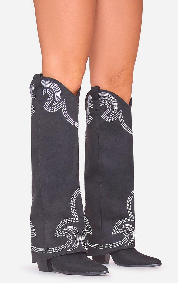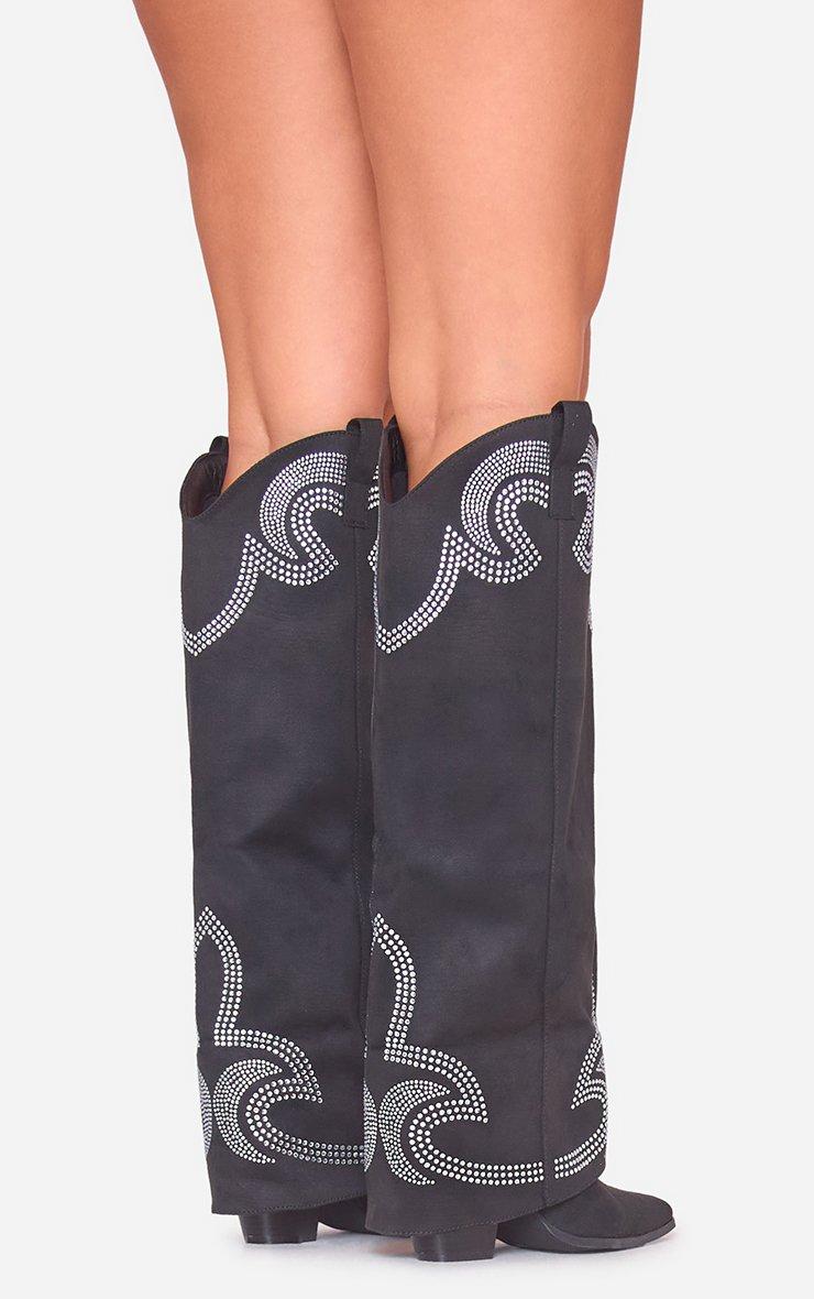 Weather Diamante Layered Detail Pointed Toe Knee High Long Western Cowboy Boot In Black Faux Suede