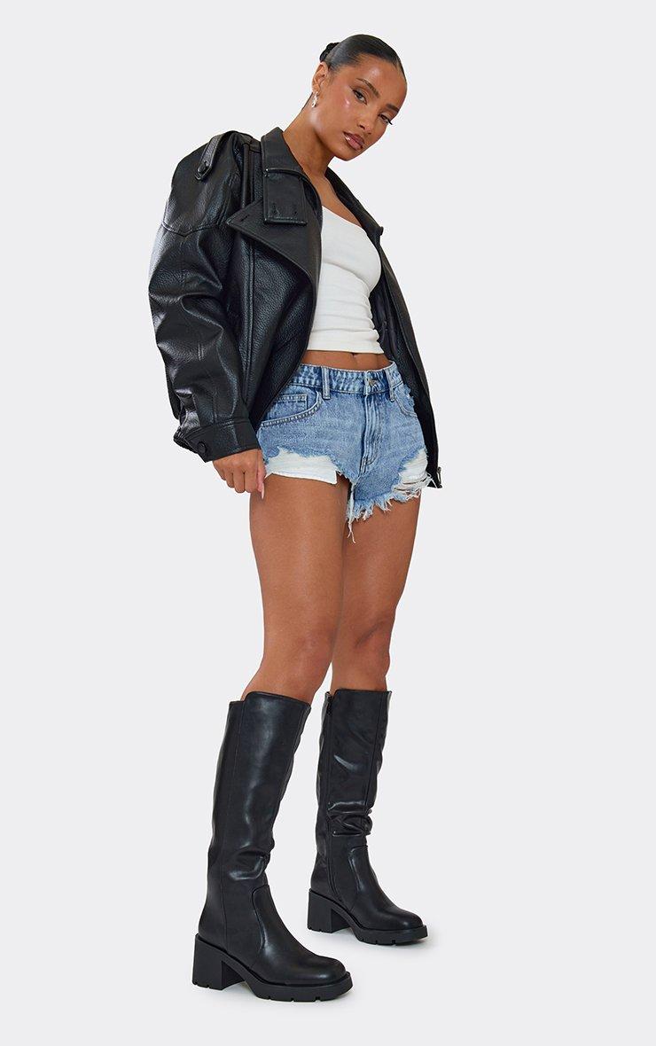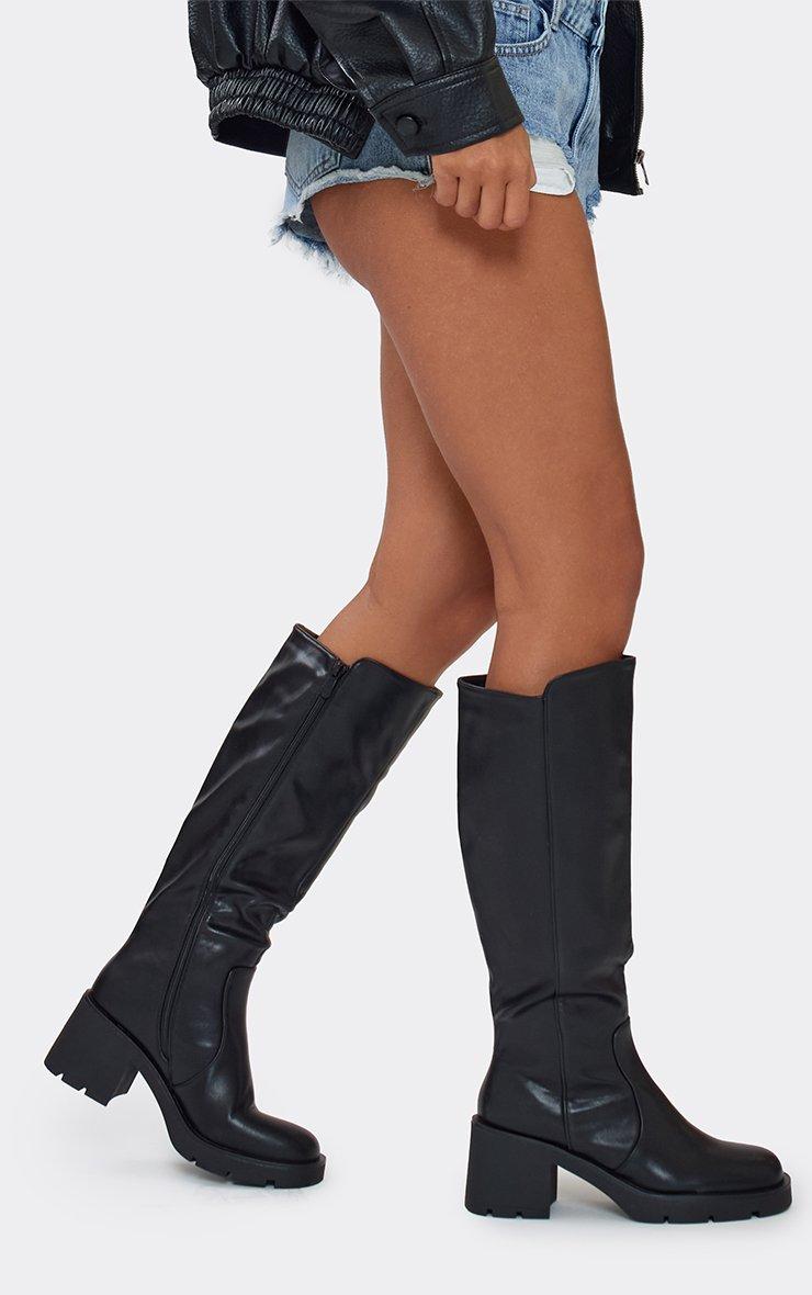 Isys Asymmetric Knee High Long Boot In Black Faux Leather