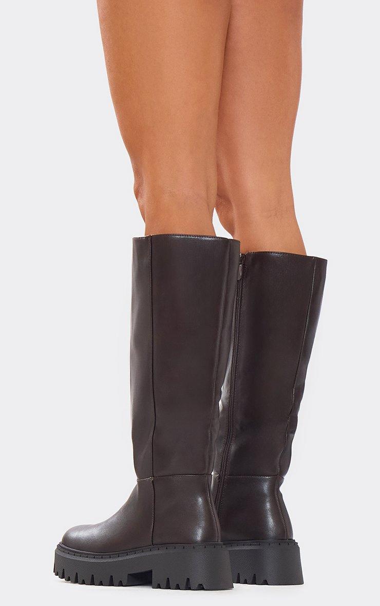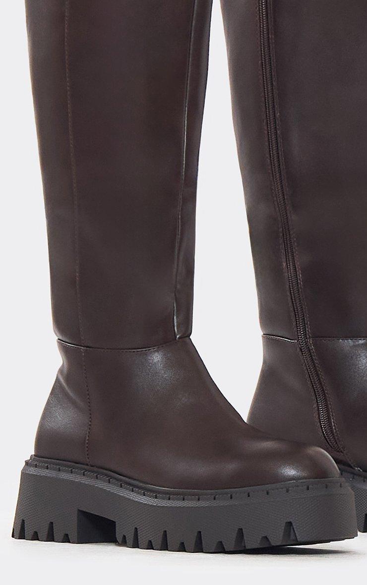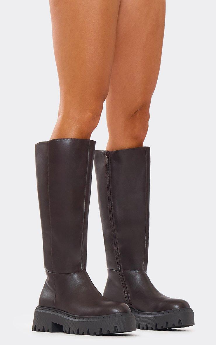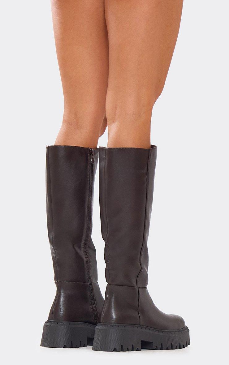 Peach Chunky Sole Knee High Long Biker Boot In Brown Faux Leather
