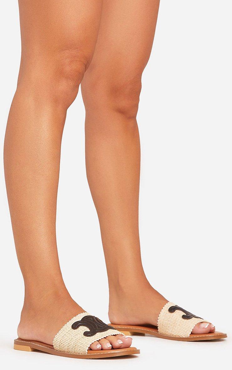 Allie Logo Detail Flat Slider Sandal In Beige Woven And Black Faux Leather