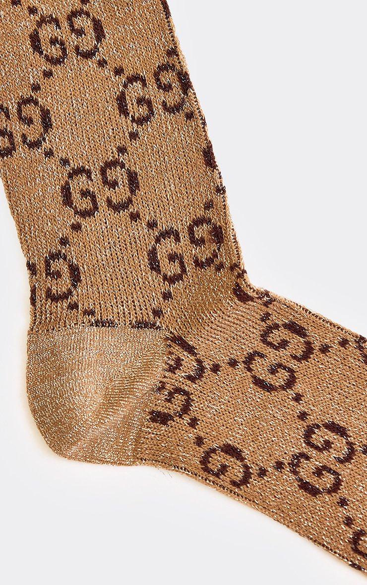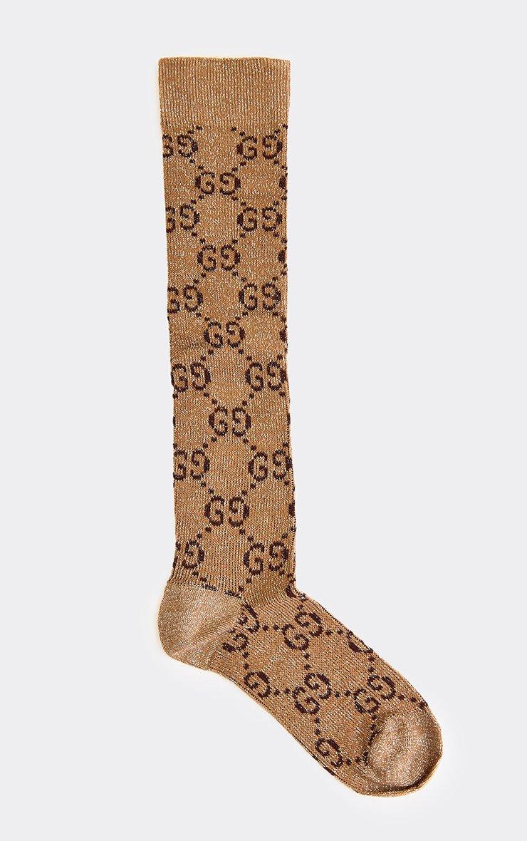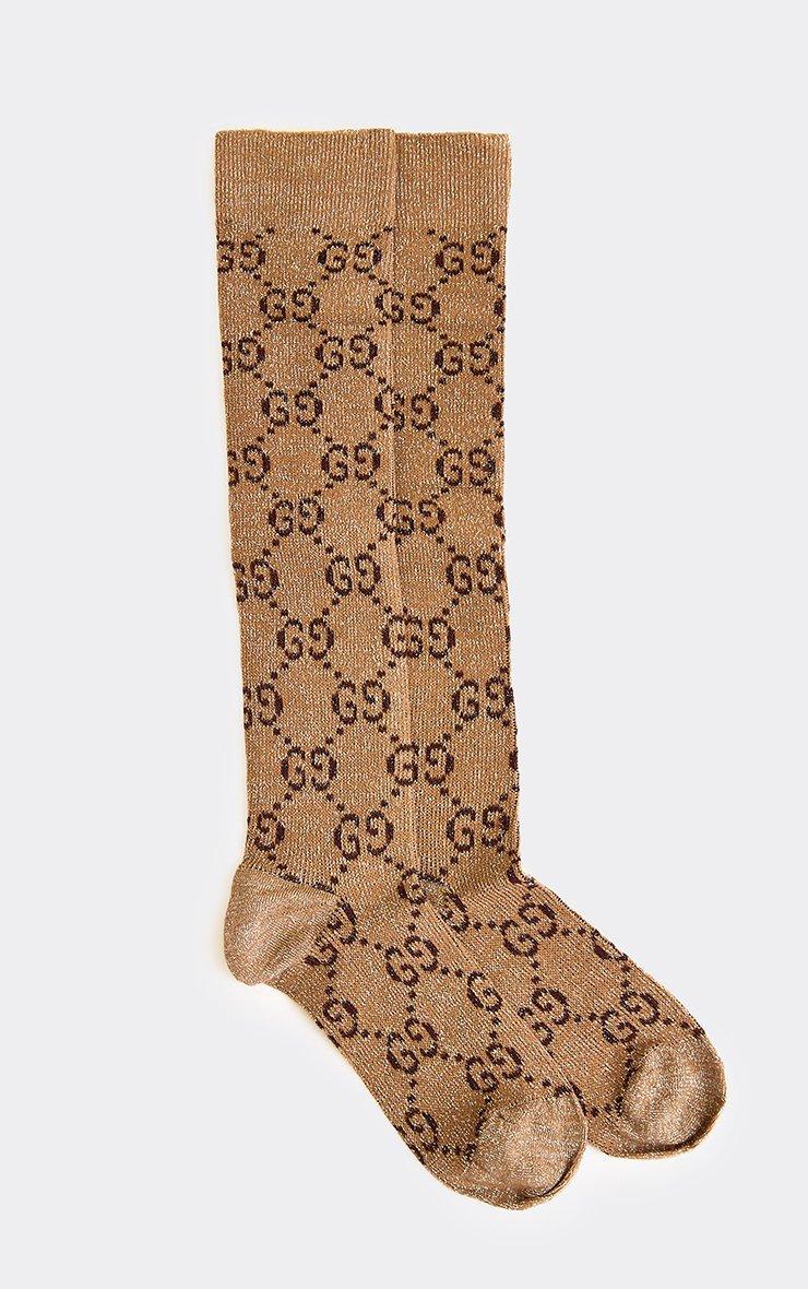 Logo Detail Knee High Long Socks In Tan