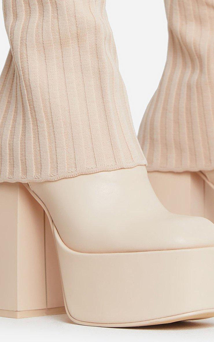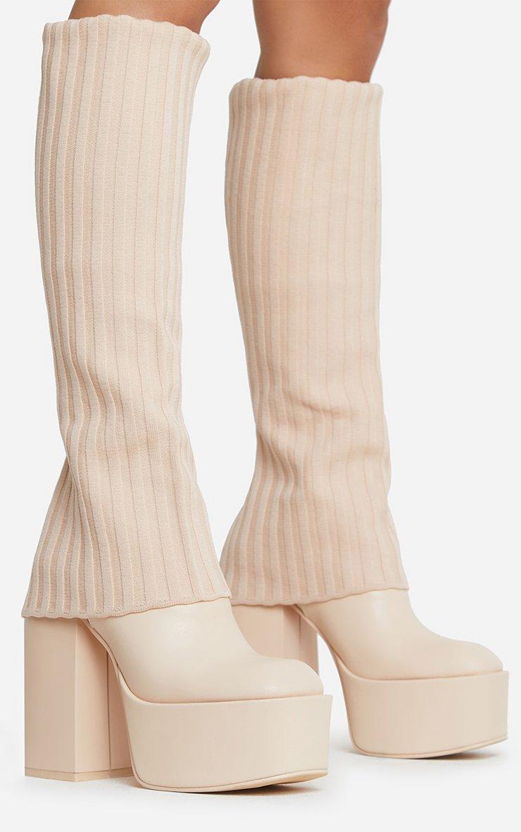 Leila Layered Knit Detail Square Toe Platform Block Heel Calf Boot In Nude Faux Leather