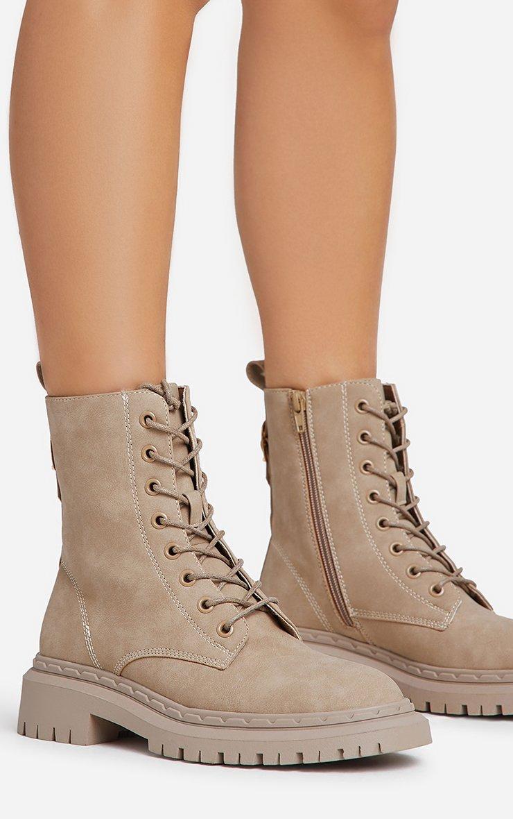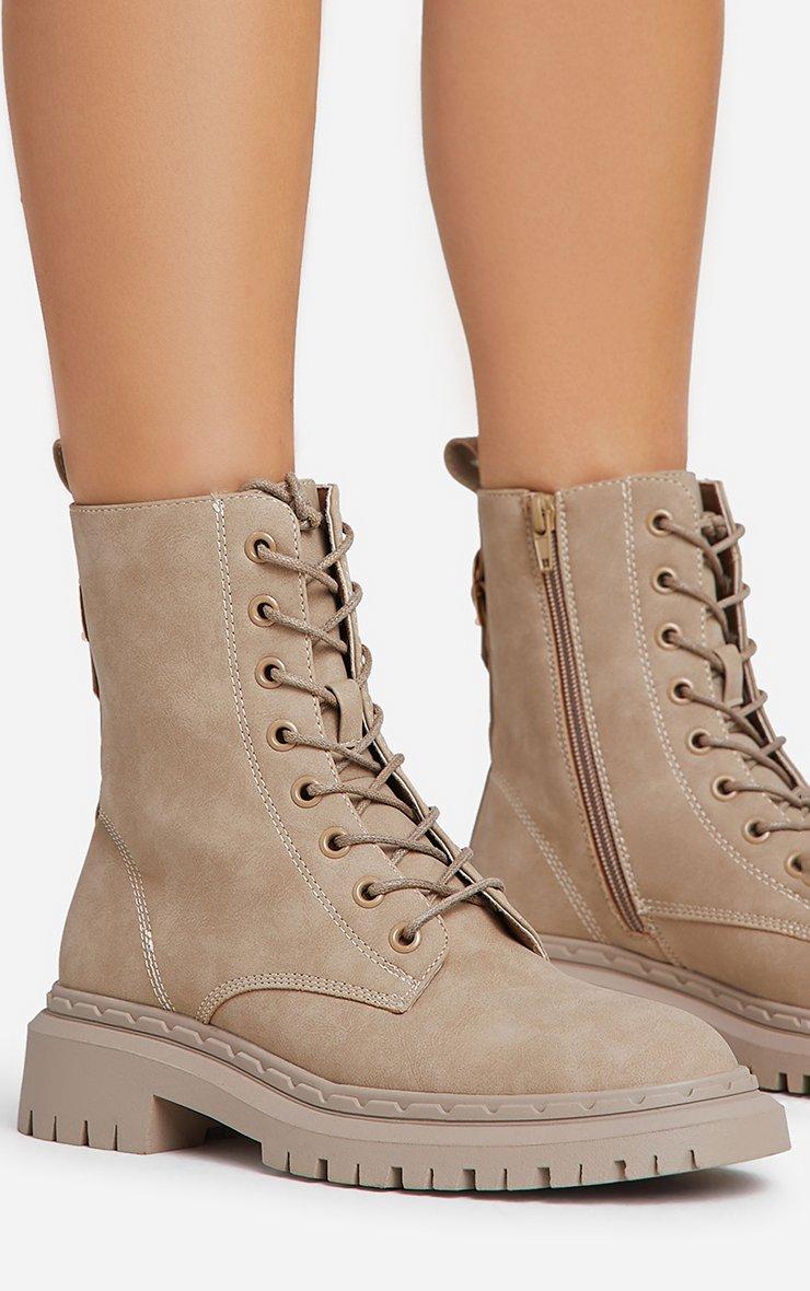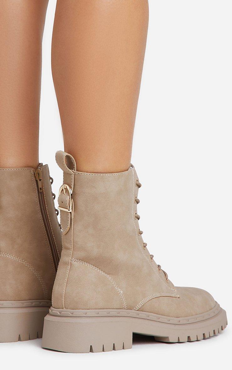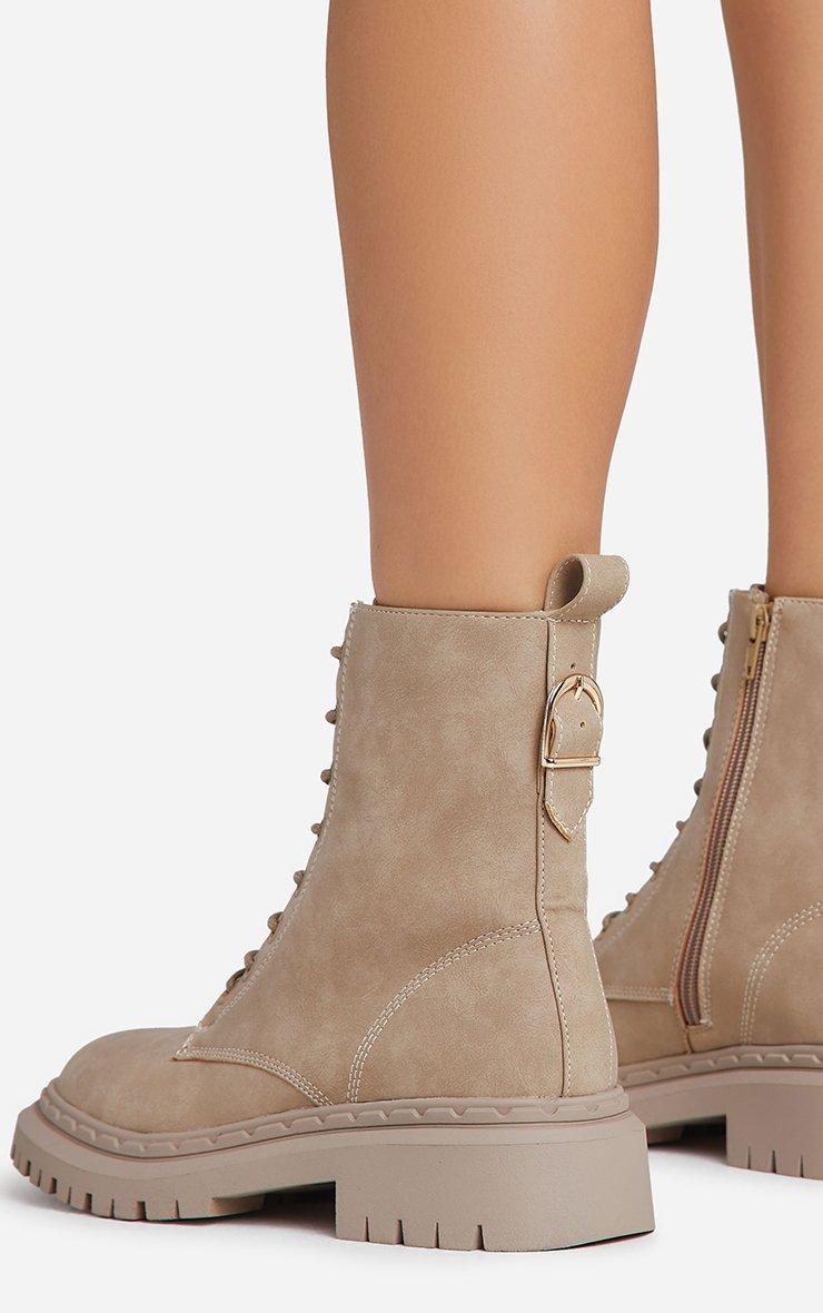 Dreamy neutral hues to compliment your off-duty look doll. Featuring a taupe soft faux leather material, with an ankle length, biker design and a lace up finish.