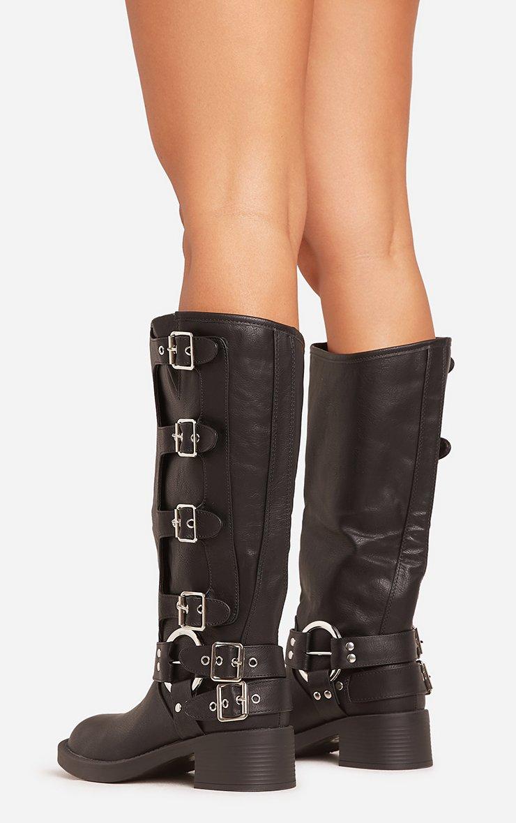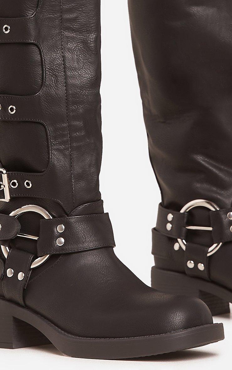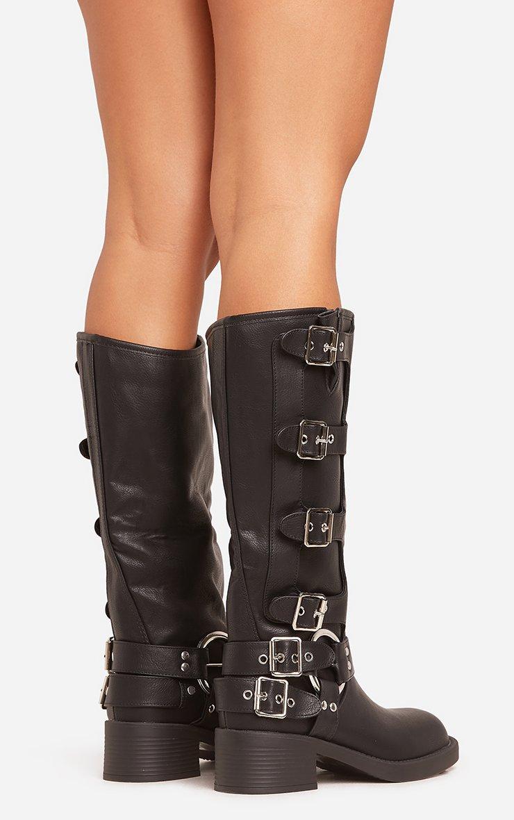 Girl, hit refresh on your boots wardrobe. Featuring a black faux leather material, with buckle side detailing, a mid calf length and a biker boot design.