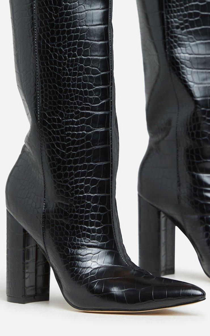 Girl, your boots collection just went up a level. Featuring a black croc print faux leather material, with a pointed toe, a block heel and a knee high length.